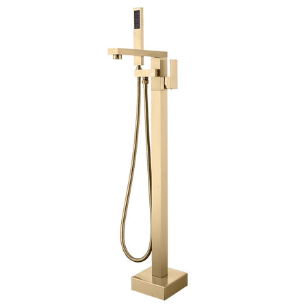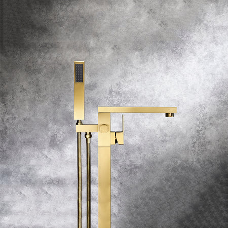 Elevate Your Bathing Experience with our Polished Gold High-Quality Freestanding Bathtub Faucet Tub Filler: Crafted with Heavy Brass, Swivel Spout, and Multipurpose Hand Shower.