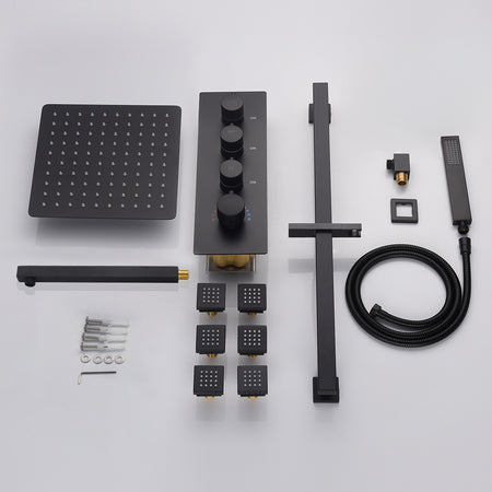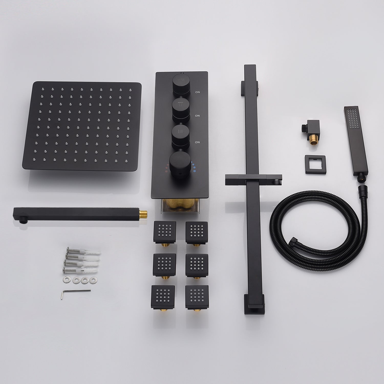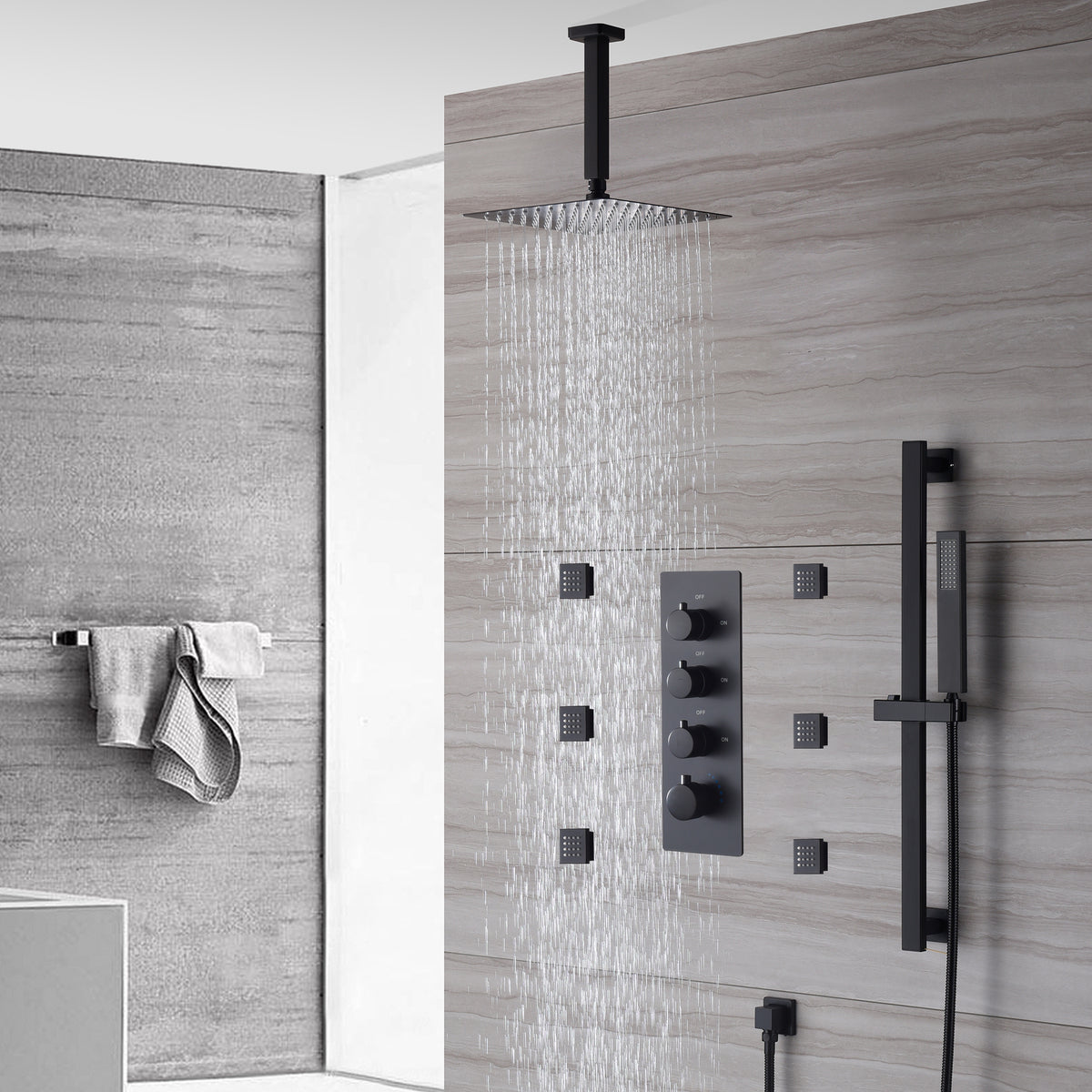 matte black ceiling mount rain shower head 3 way thermostatic shower faucet with body jets and sliding bar