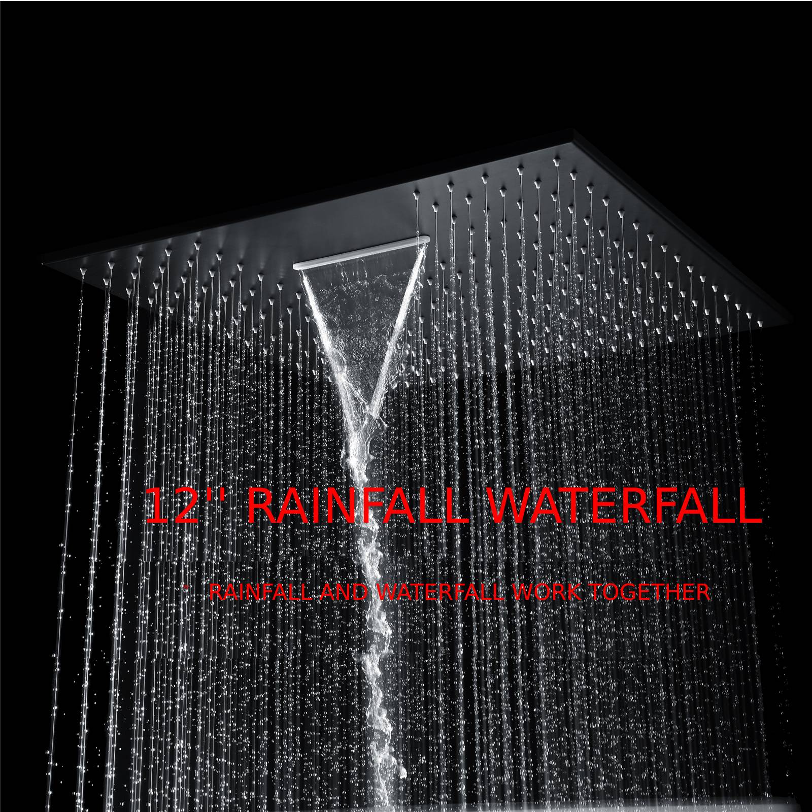 Rain Showerhead: Choose between a 12" x 12" or 16" x 16" fixed rain showerhead. The optional LED light works by water flow, changing color according to water temperature: blue LED at 32-86℉, green LED at 86-104℉, red LED at 104-122℉, and flashing red LED at 122-212℉. No batteries required. The 12-inch non-LED rainfall waterfall shower head combines both the rainfall and waterfall functions, operating them simultaneously rather than separately.