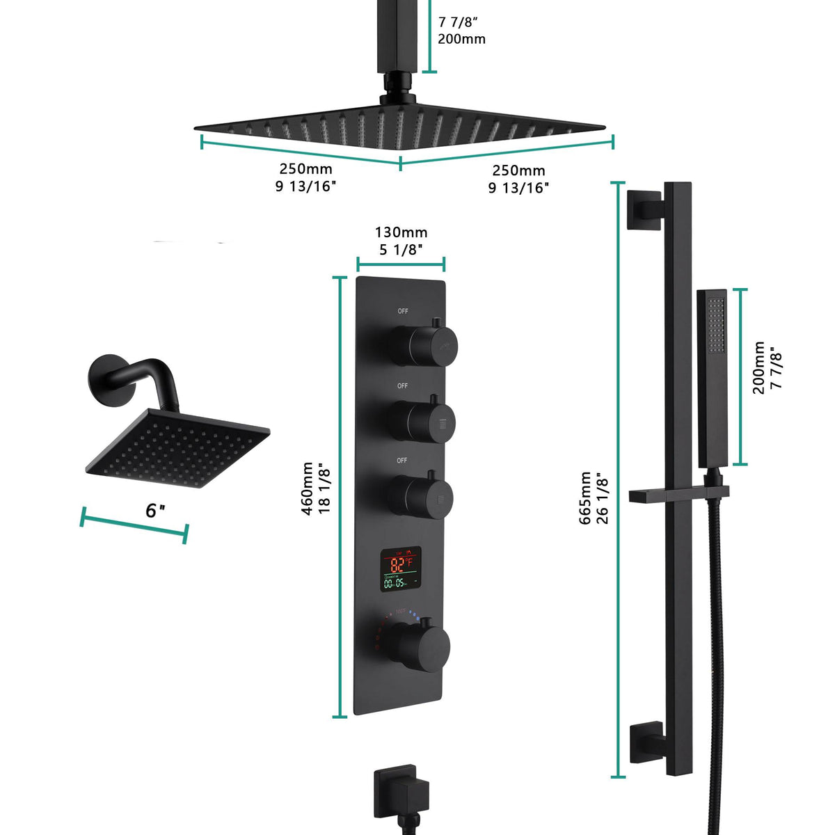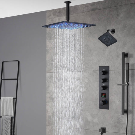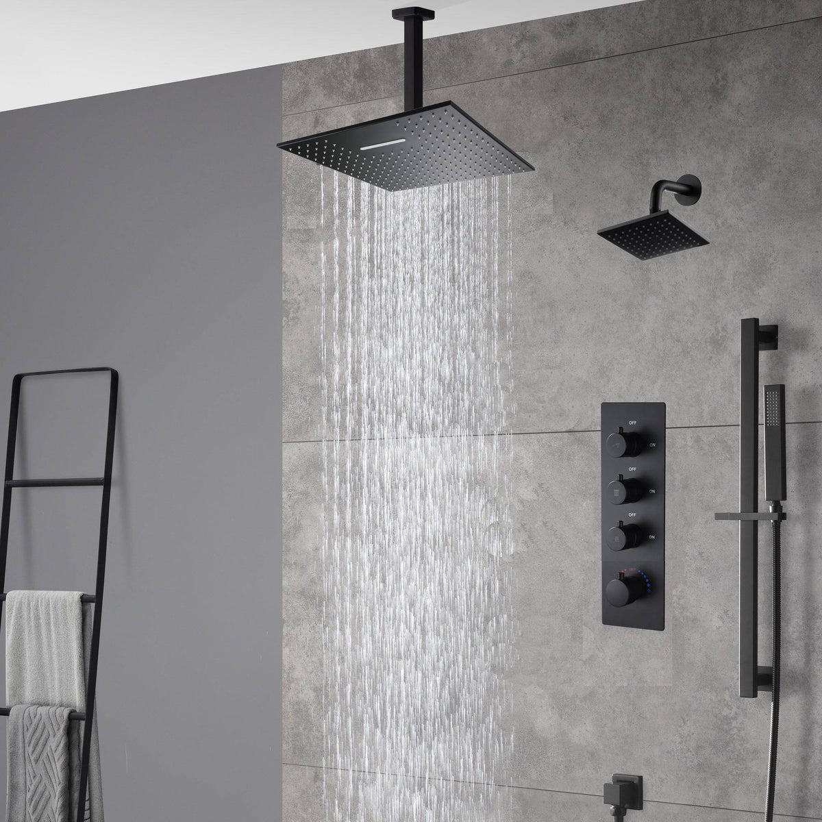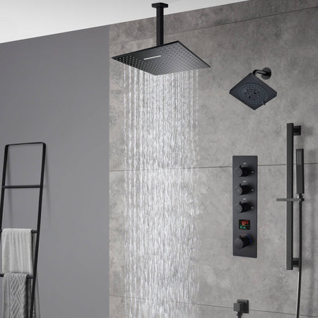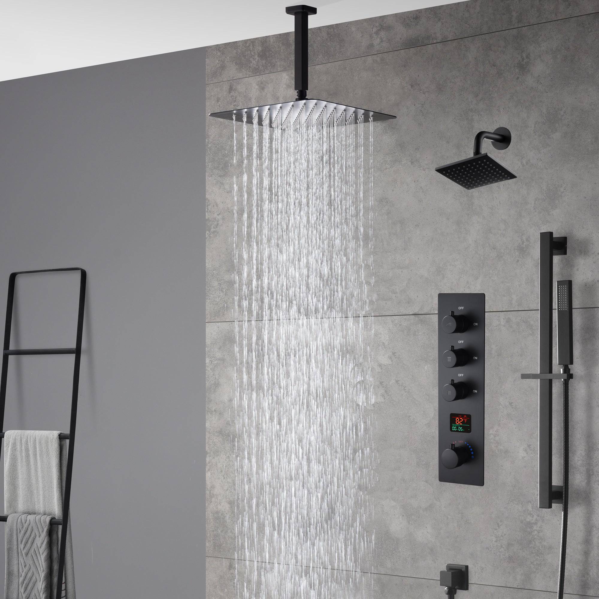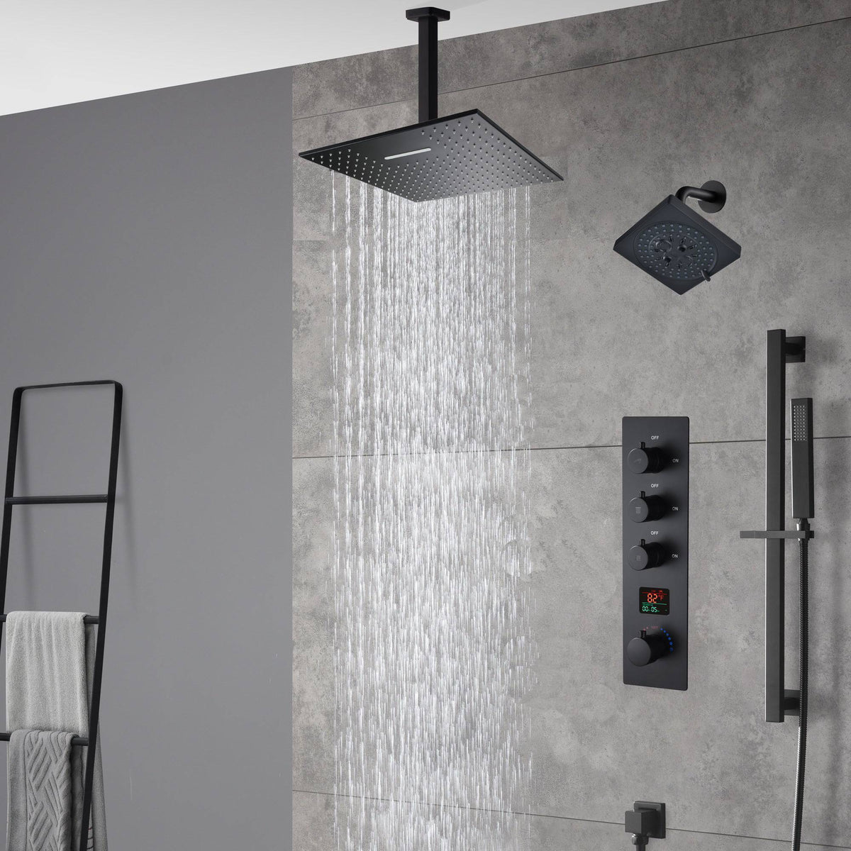 matte black ceiling mount 12 inch or 16 inch rain head 3 way digital display thermostatic shower faucet with Regular head wall mount