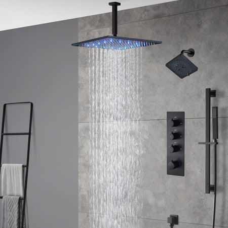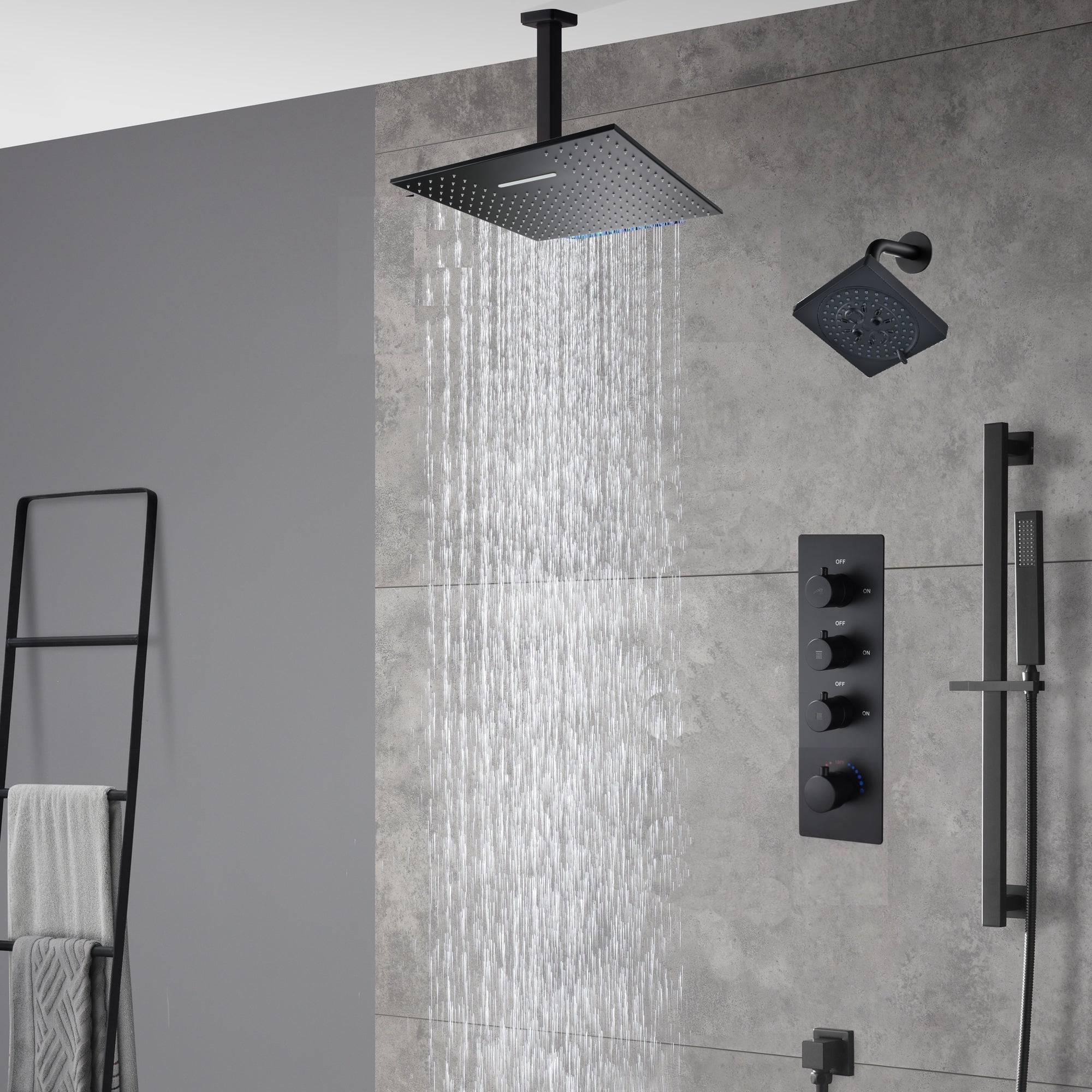 Matte Black 3-Way Thermostatic Shower System with LED Rain Showerhead, Handheld Shower, and Regular Head