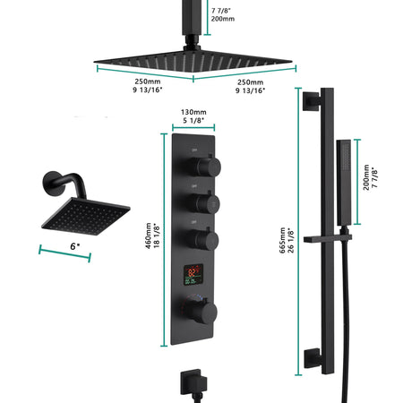 Ceiling Shower Arm: The system includes a 9" ceiling-mounted shower arm made of sturdy brass. Its matte black finish matches the rest of the shower ensemble perfectly.