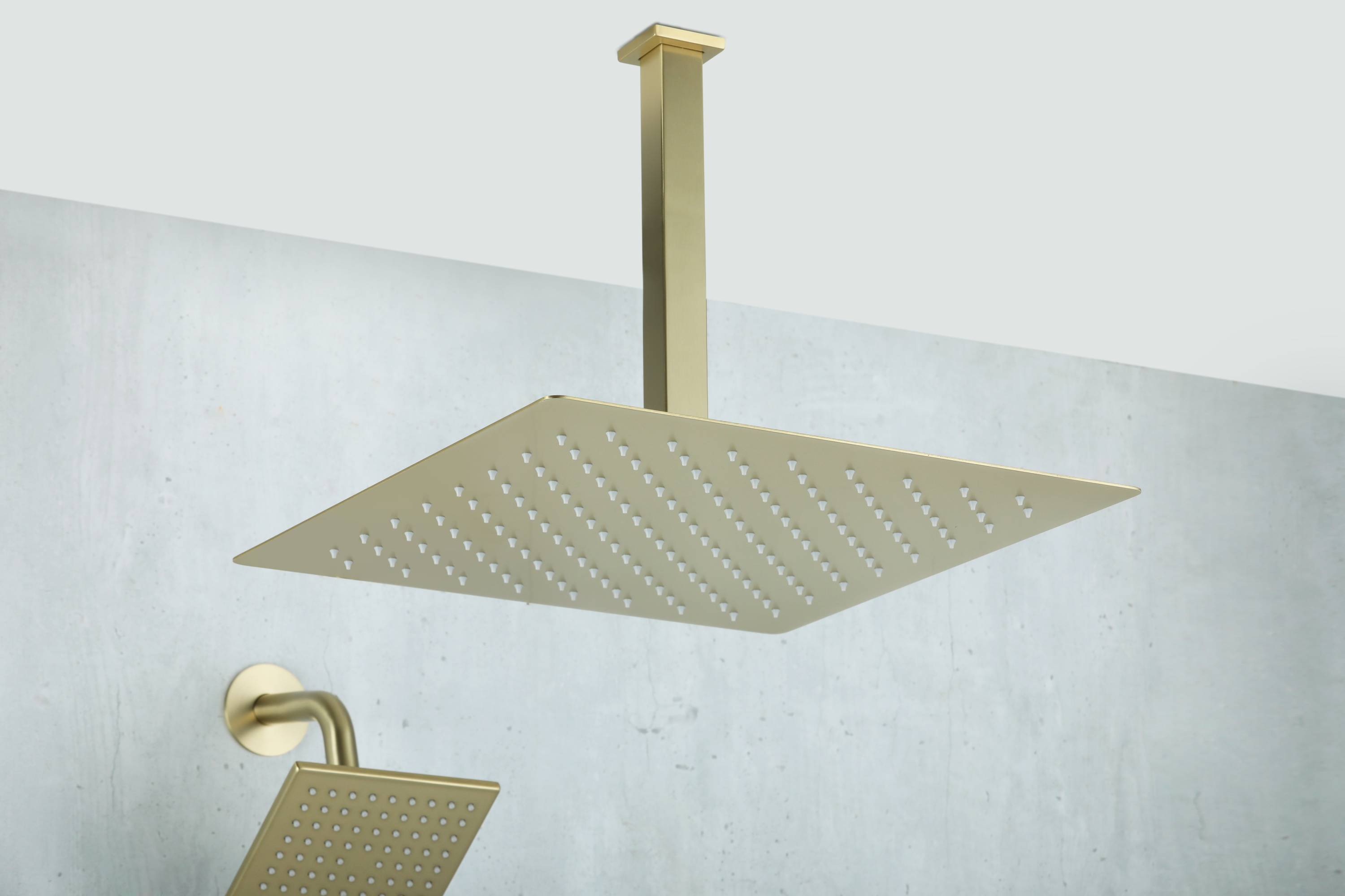 Choose between a 16x16 inch or 12x12 inch fixed rainfall shower head, made from brass and stainless steel and finished in brushed gold. These ceiling mount shower heads feature a swivel angle for added flexibility and connect via G1/2" standards.