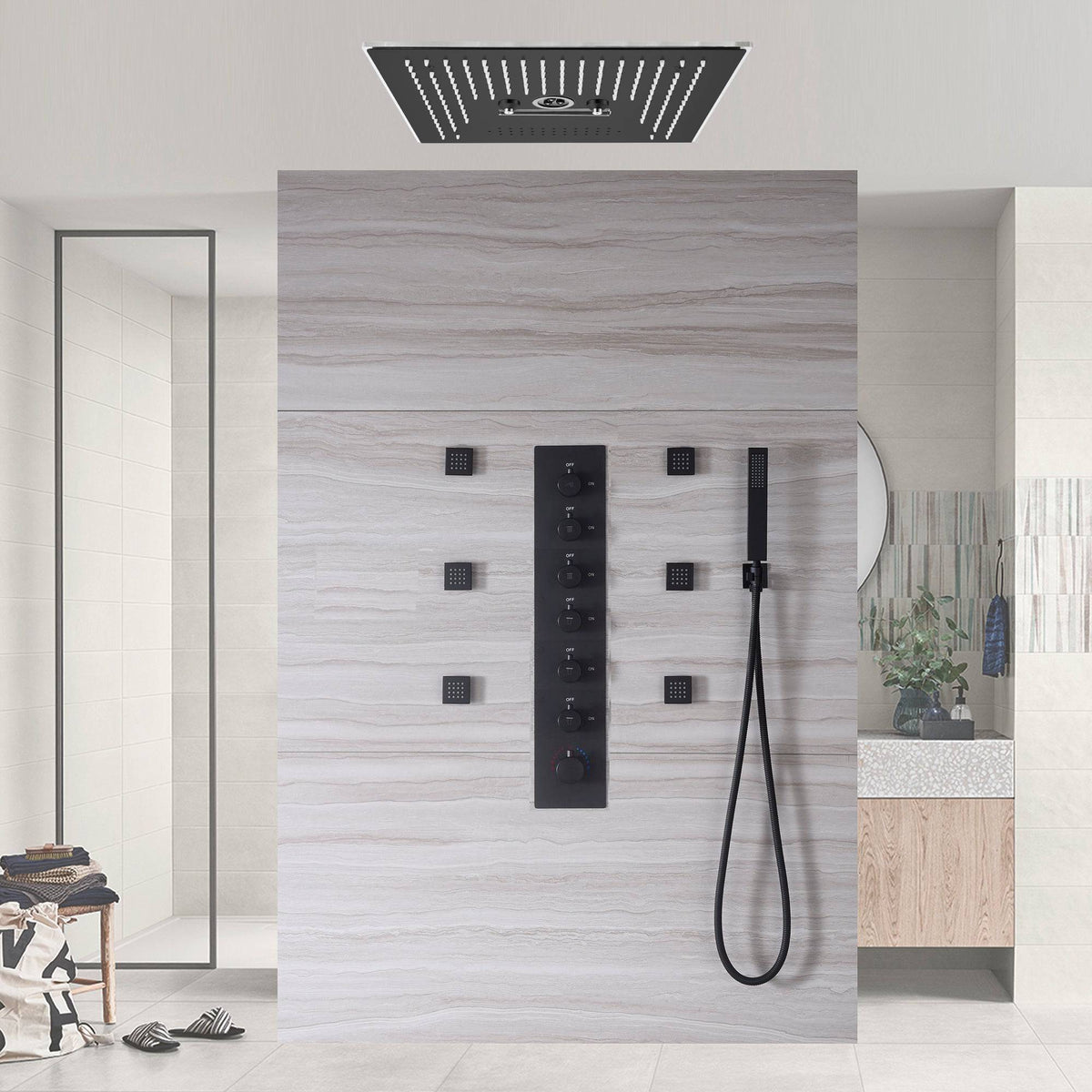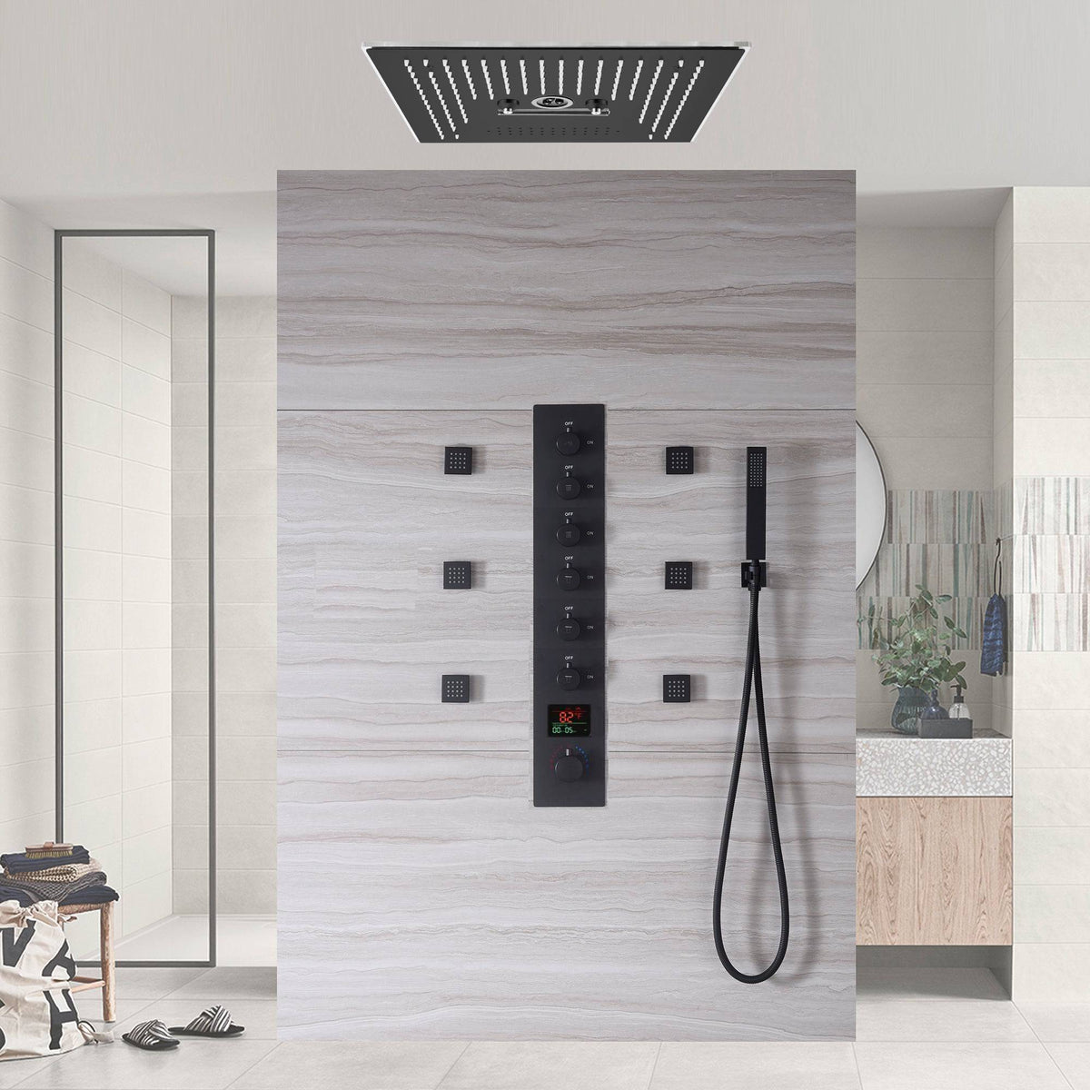 Matte Black 6-Way Digital Display Thermostatic Shower Faucet: Flush-Mounted 16-Inch Head, Rainfall, Waterfall, Mist, Hydro-Water Massage, 64-Color LED Lighting, and Bluetooth Music