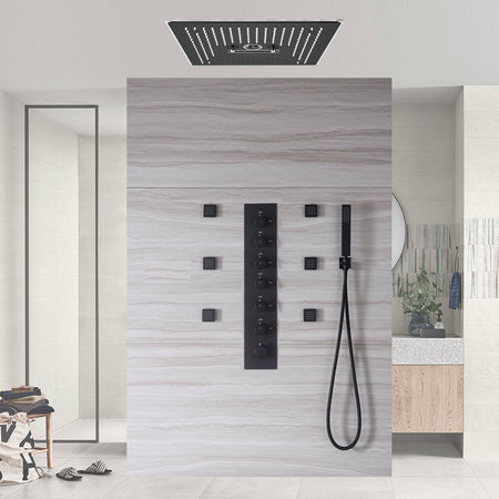 Experience an unparalleled blend of luxury and technology with our Matte Black 5-Way Thermostatic Shower Faucet. This sophisticated system features a flush-mounted 16-inch LED shower head with Bluetooth music capabilities, remote-controlled lighting, and body jets.