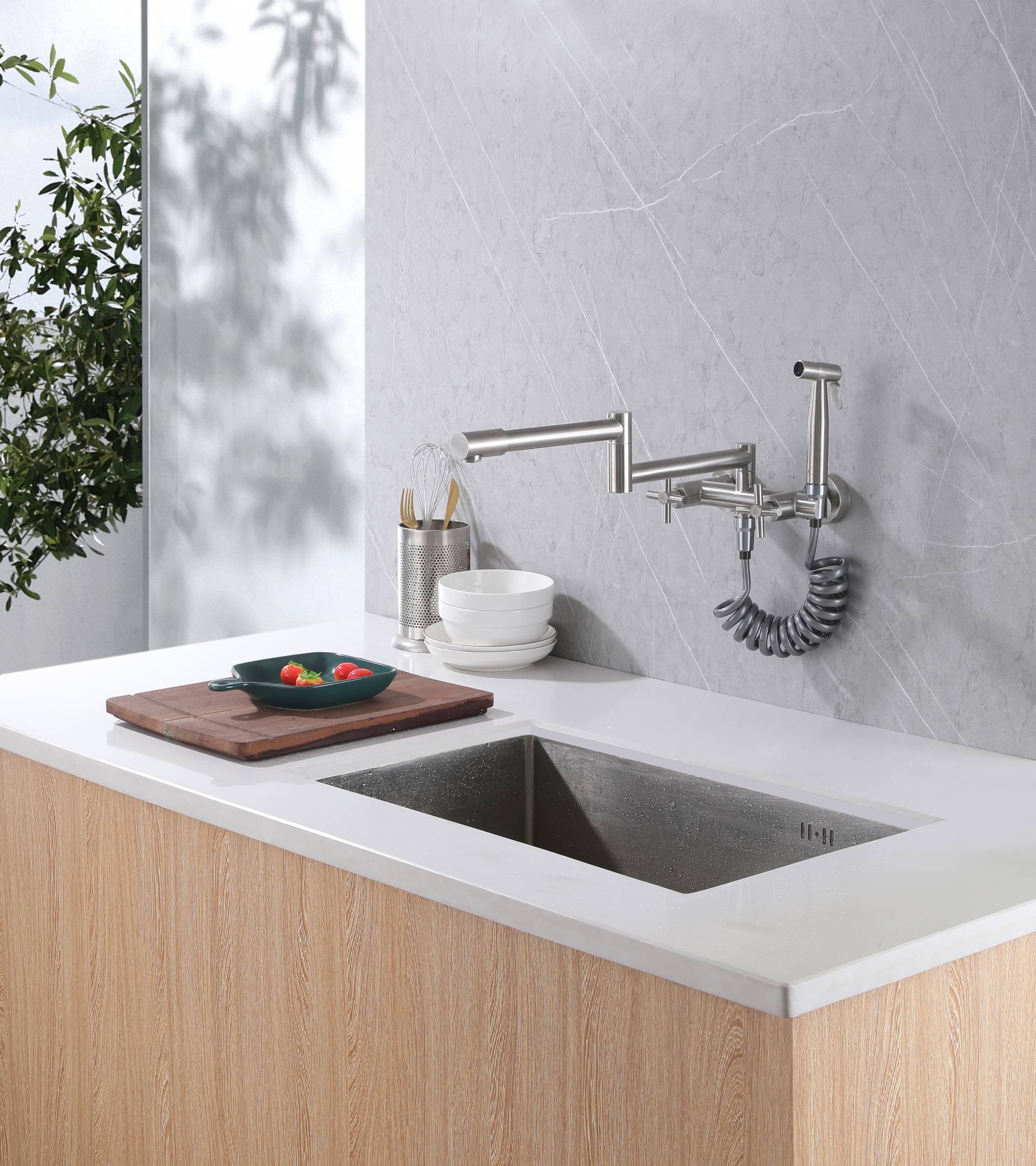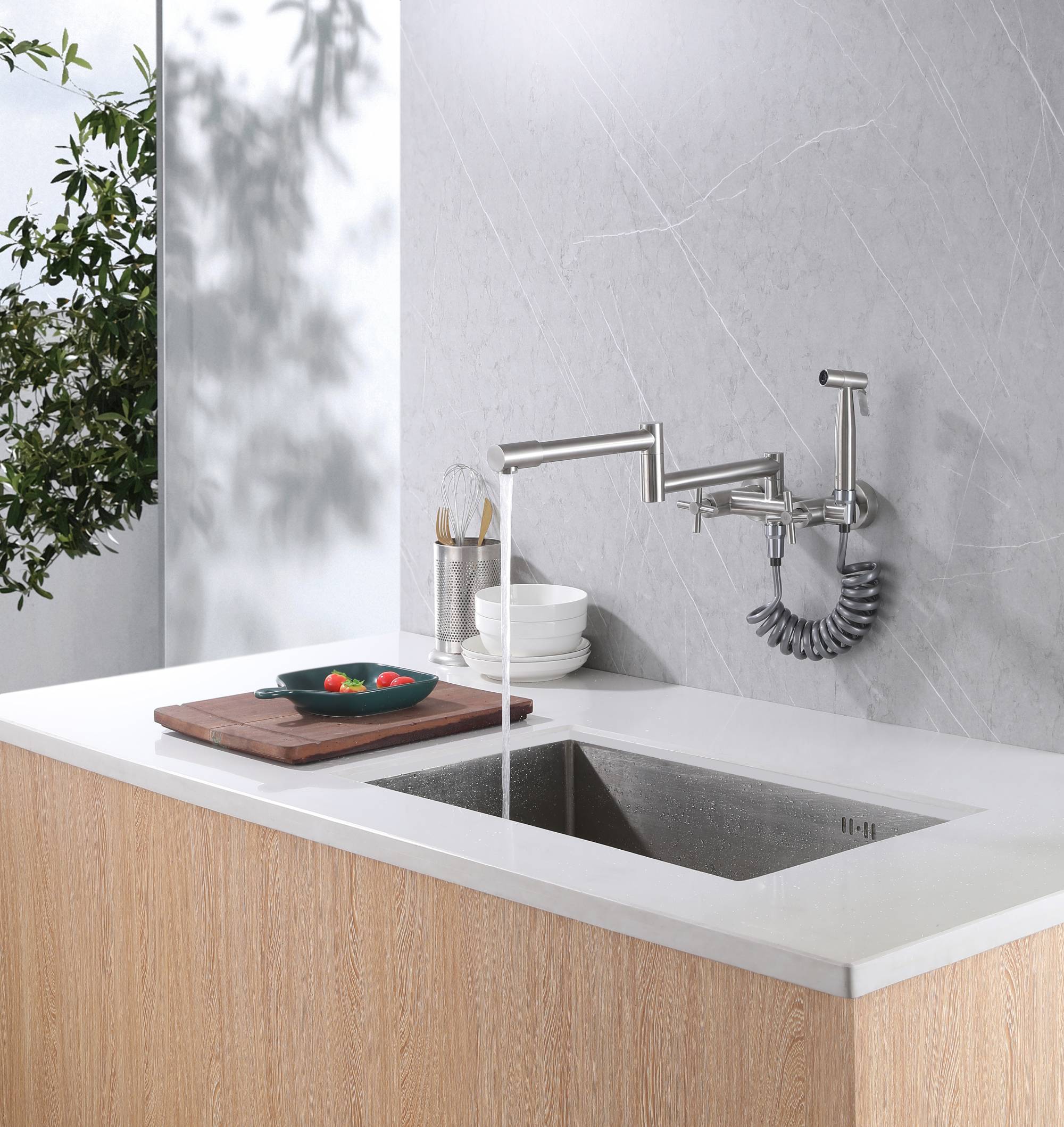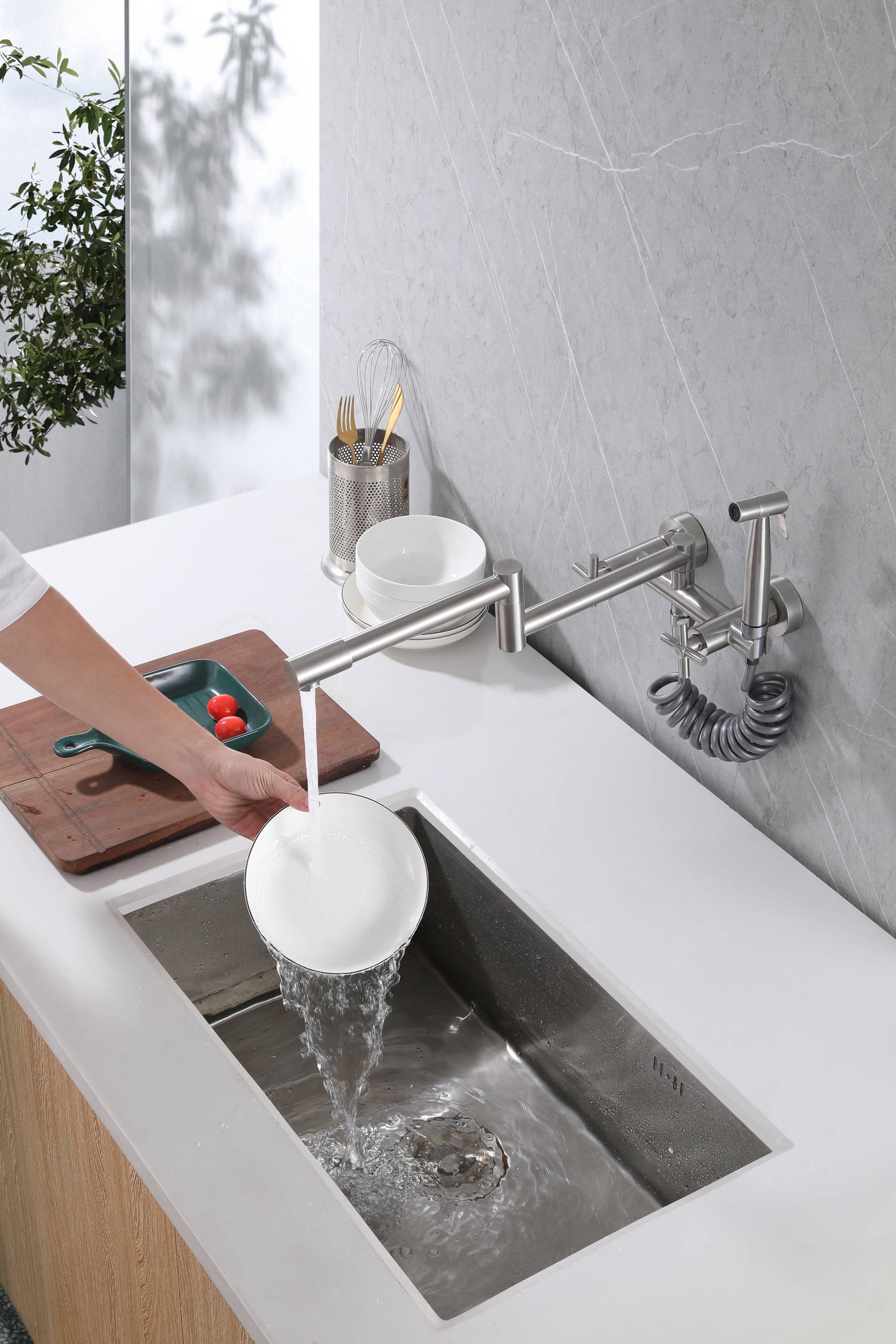 Brushed nickel Pot Filler Faucet Folding Stretchable Brass Hot & Cold Kitchen Faucet Wall Mount with side sprayer