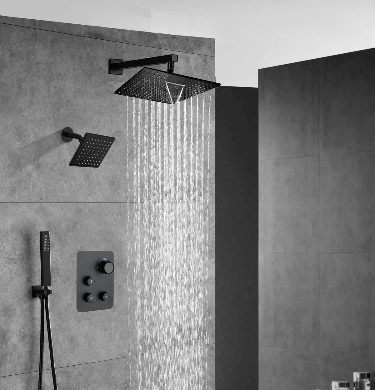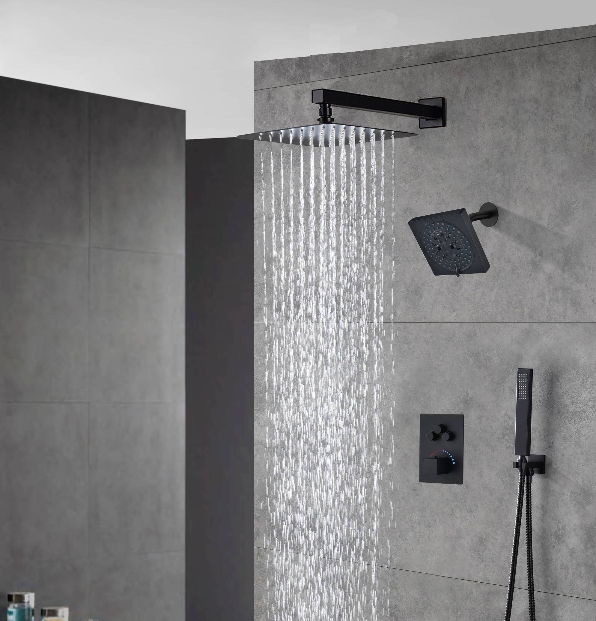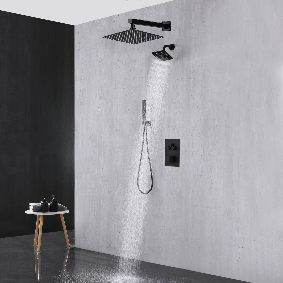 Matte Black Wall Mount 6" Regular Shower Head with 12" or 16" Rainfall Head, 3-Way Thermostatic System