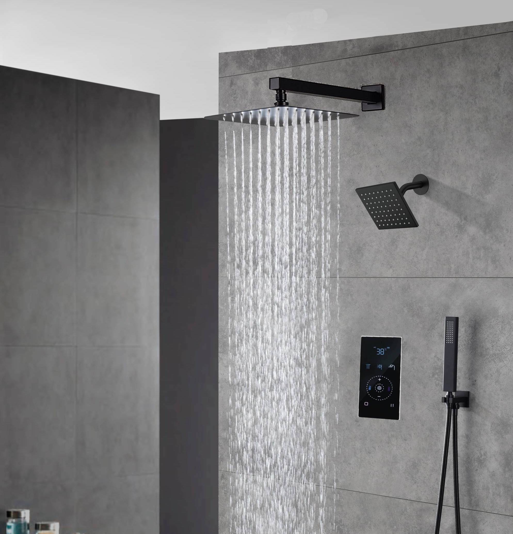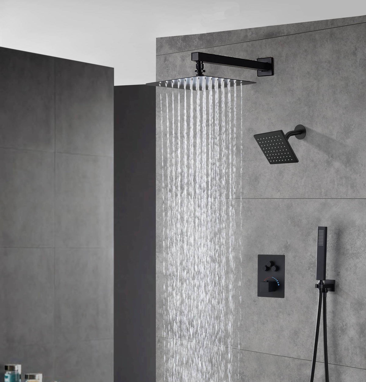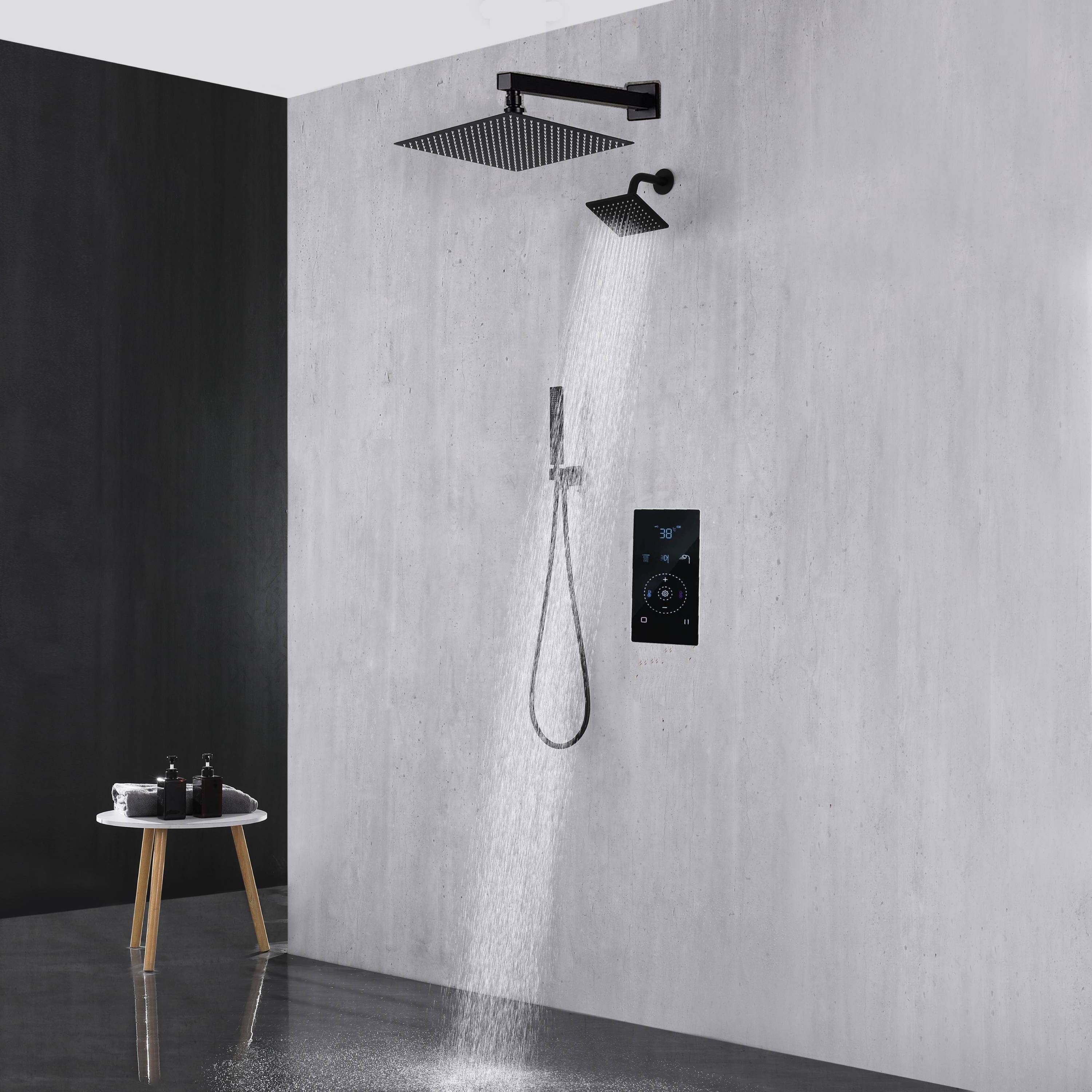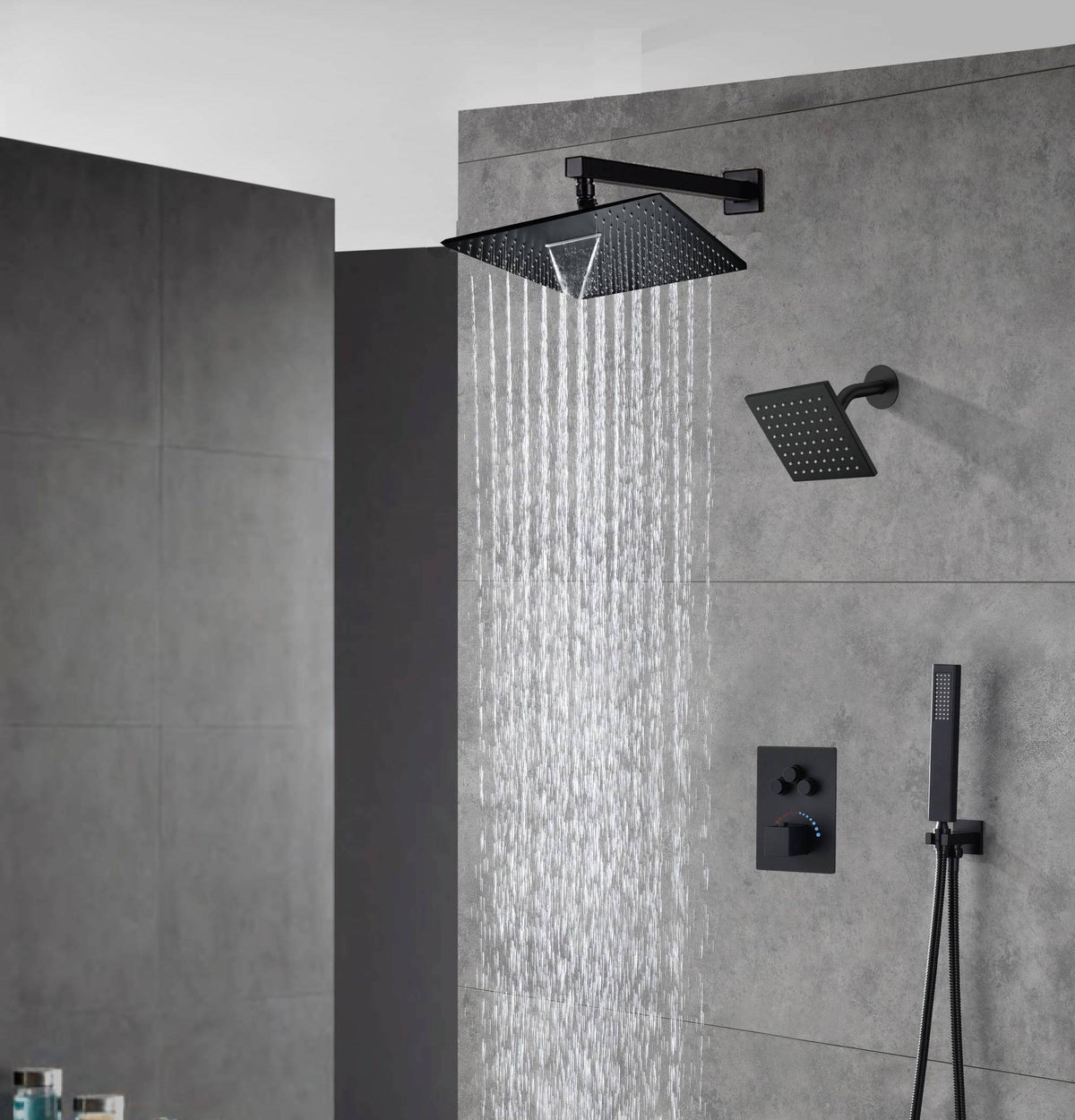 Matte Black Wall Mount 6" Regular Shower Head with 12" or 16" Rainfall Head, 3-Way Thermostatic System