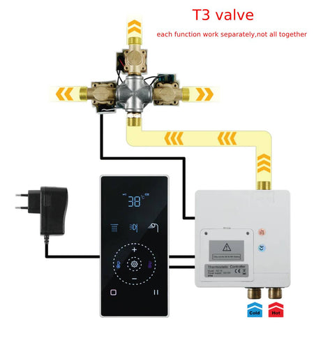 Heavy-duty brass construction; requires precise hot and cold water pipeline positioning. Optional T3 valve with digital panel available T3 run each function separately, not all together and T3 digital panel need connect to the electronic power.