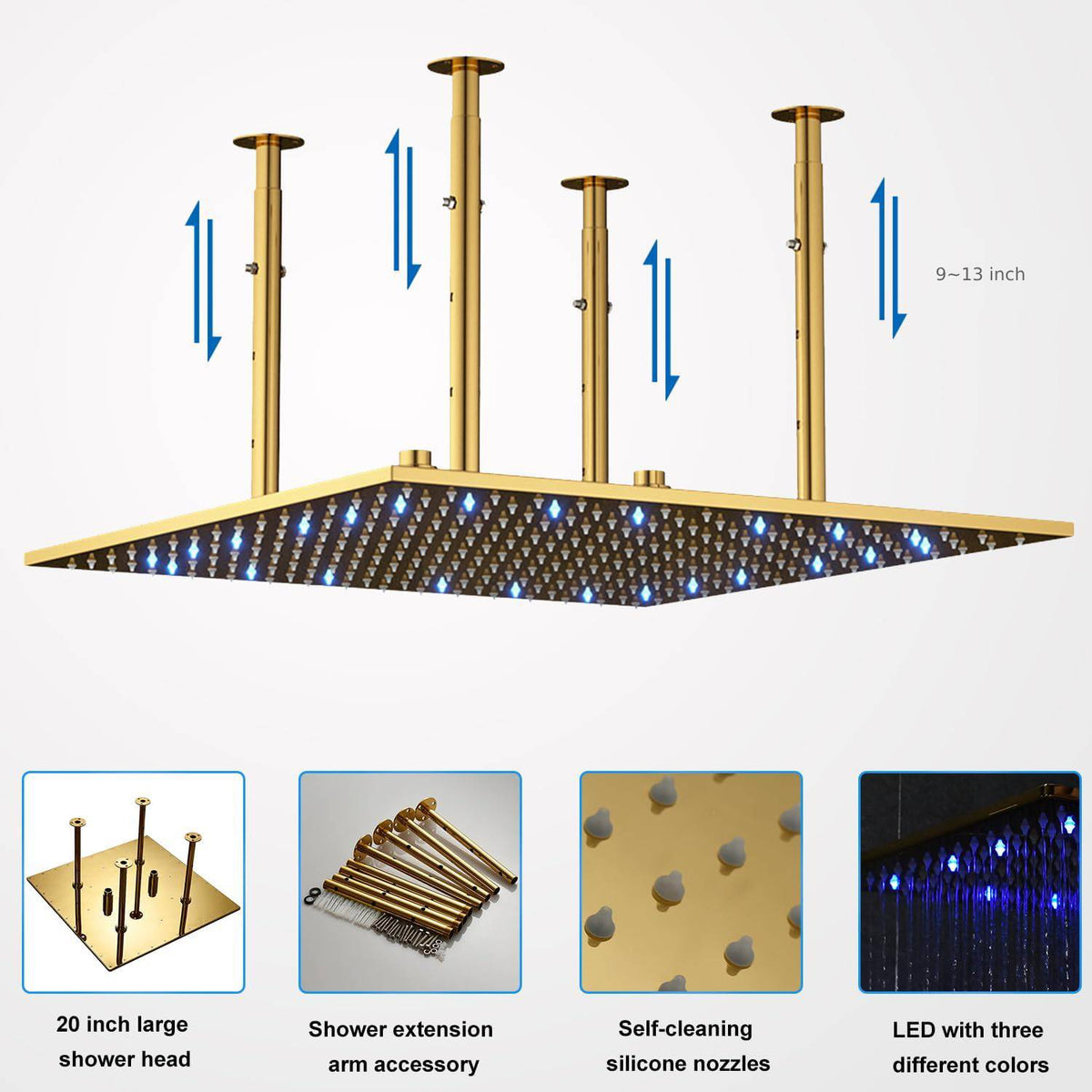 Brushed Gold 20-Inch Ceiling Mounted Rainfall Shower Head: 3 LED Colors and Classic Elegance
