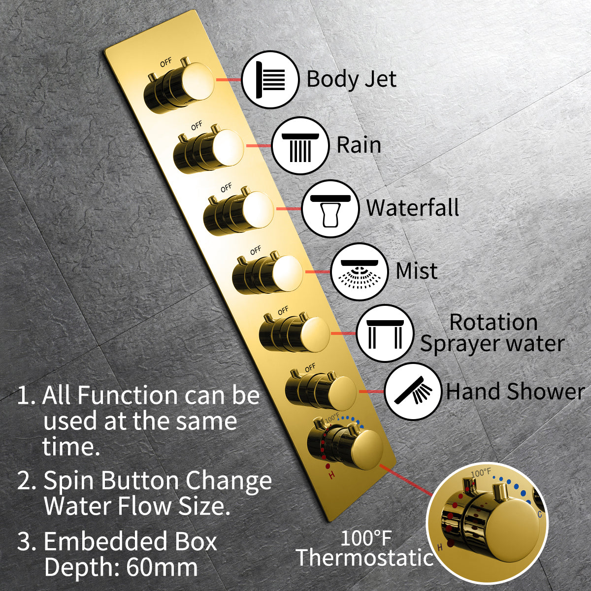 Thermostatic Valve:ย The 6-way thermostatic valve allows for precise control of water pressure, flow, and temperature. Plus, it's designed with an anti-scald feature for your safety.