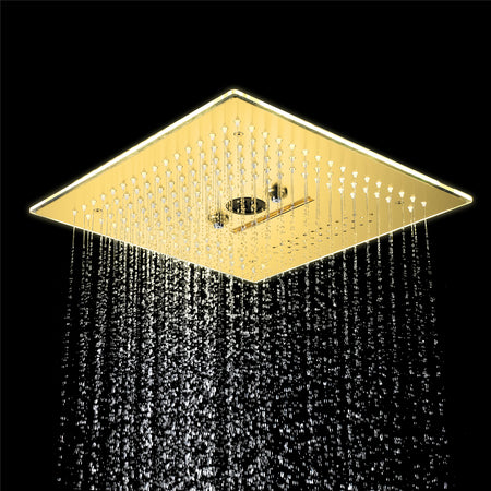 16-Inch Polished Gold Flush Mount Shower Faucet Set: 6-Way Thermostatic Control, 64-Color LED, Bluetooth Music, Rainfall-Waterfall-Mist Functions, Rotating Hydro Jet, and Regular Head