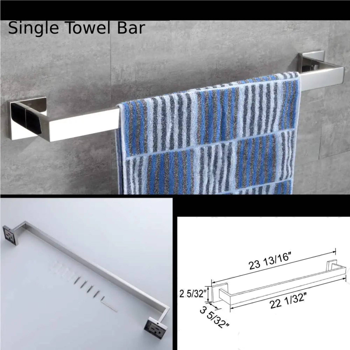 Complete 4-Piece Square Stainless Chrome Bathroom Accessory Set - Wall Mounted Towel Bar, Towel Ring, Toilet Paper Holder, and Robe Hook