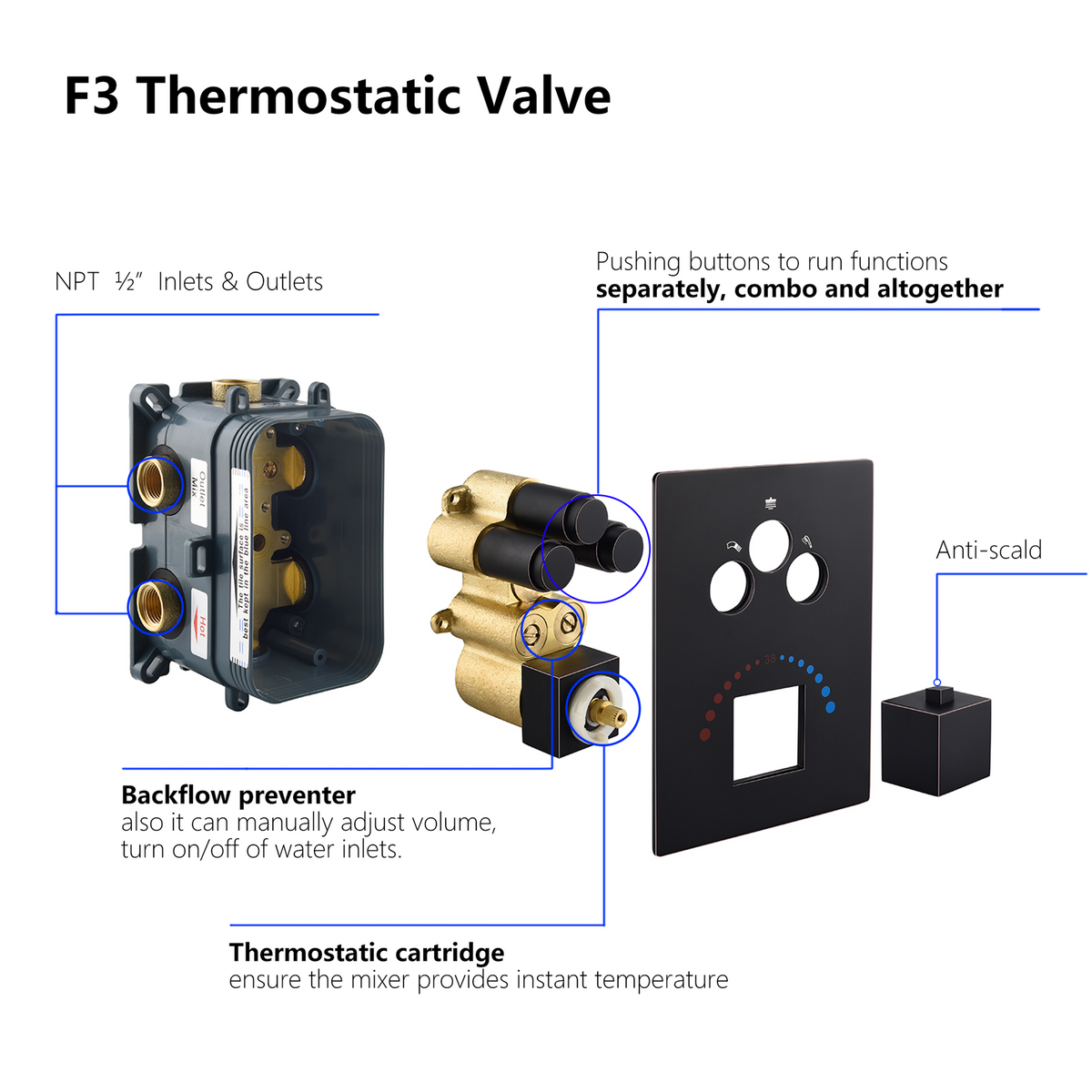 3-Way Thermostatic Valve with Trim: The system includes a 3-way thermostatic valve with trim, allowing each function to work simultaneously or separately for added versatility. The ORB finish adds elegance to your shower system. The valve ensures anti-scald protection, providing water at a constant and desired temperature to keep you and your family safe.