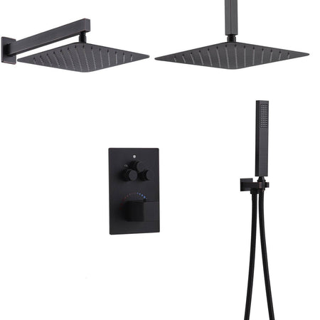 12-Inch Non-LED Light Ceiling Mounted Oil Rubbed Bronze 3-Way Thermostatic Shower Faucet System with Wall Mount 12-Inch Rainfall Shower Head
