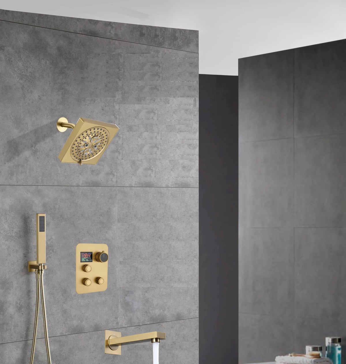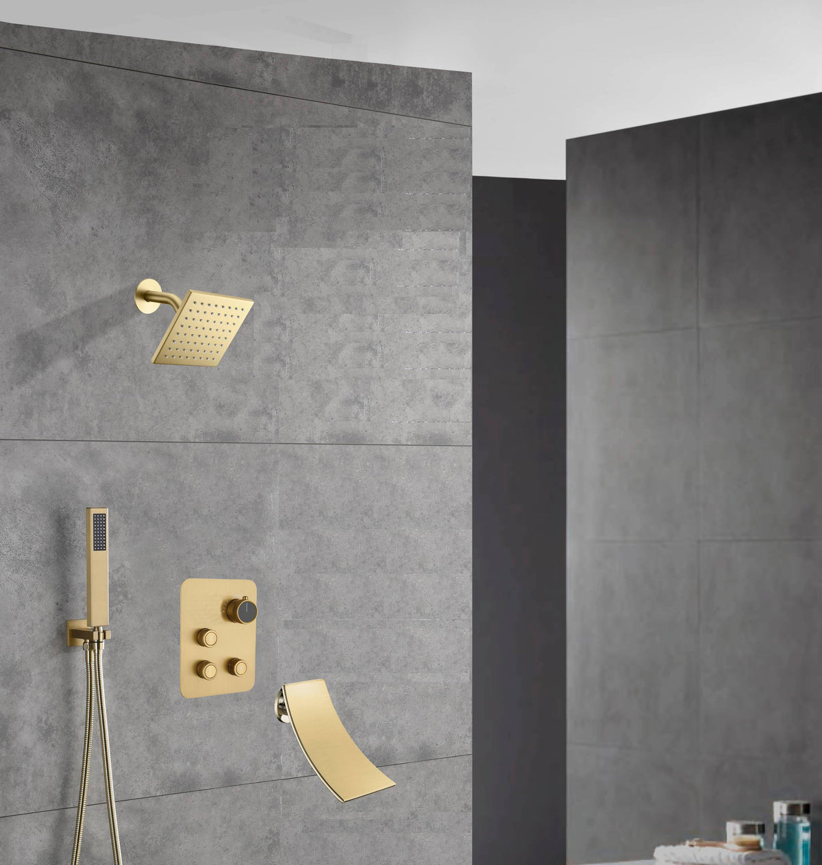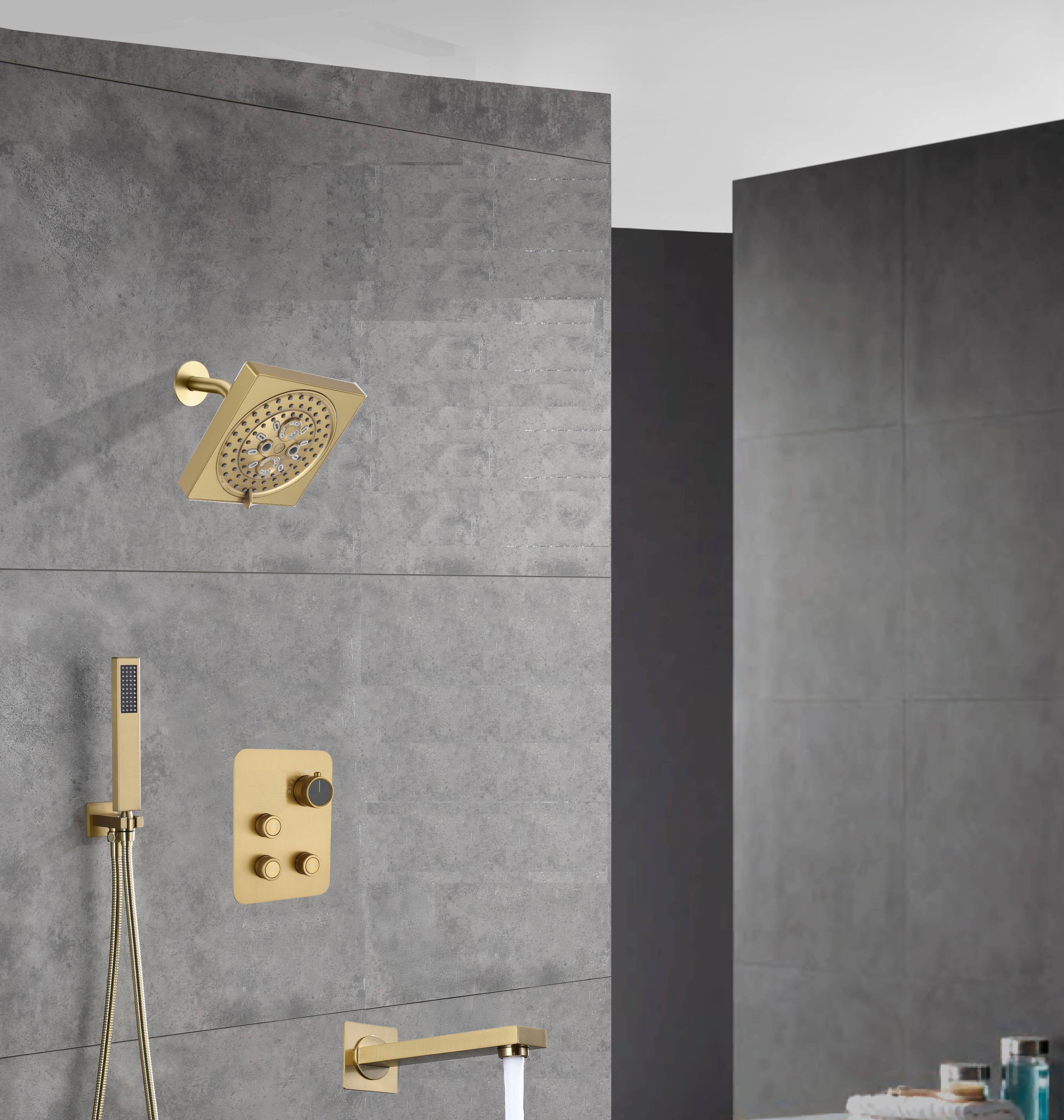 wall mount regular head Brushed gold 3 way Thermostatic Shower valve system with tub spout that each function run all together and separately