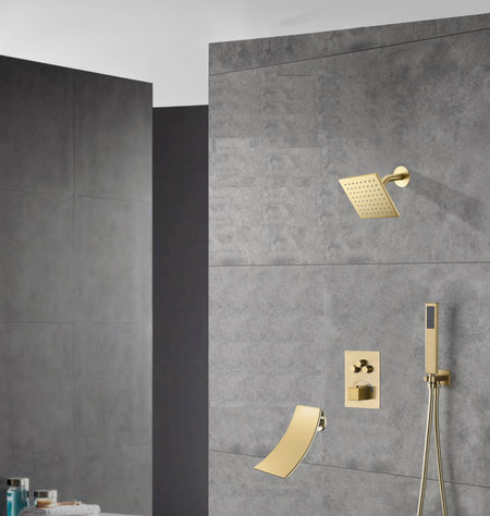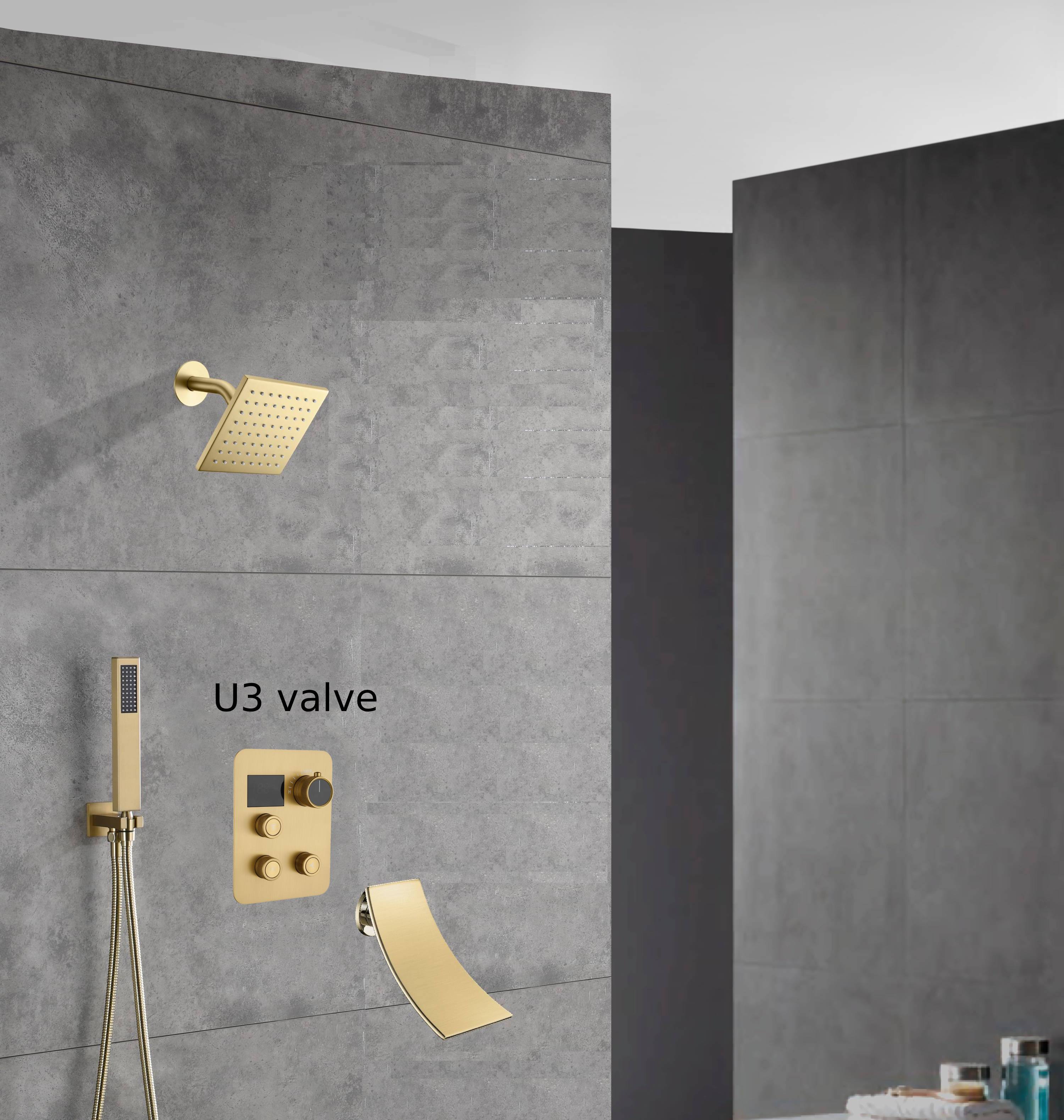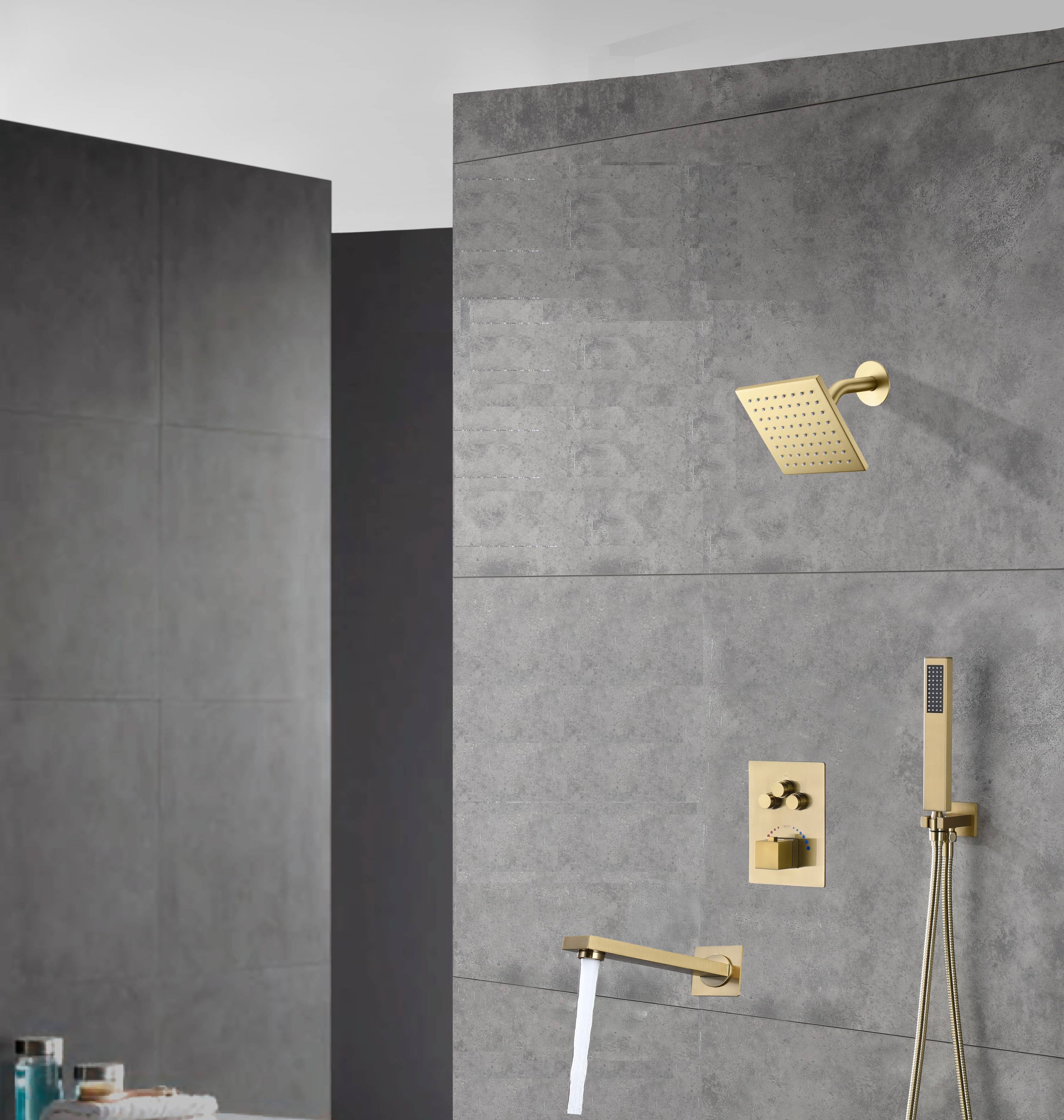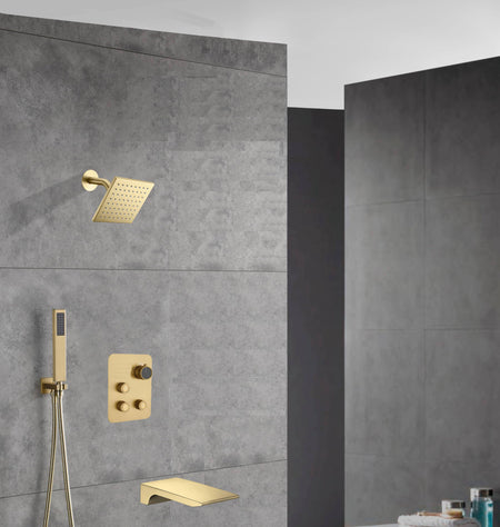 wall mount regular head Brushed gold 3 way Thermostatic Shower valve system with tub spout that each function run all together and separately