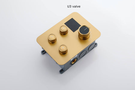 - (2) U3 valve style: with 3 push buttons and push buttom to turn on or off the water and it can adjust the water flow and pressure via switching the button. it is with digital display that work by water flow and no need battery. each function work all together and separately; Water flow is designed to be from 0~7.8GPM and 1/2'' or 3/4'' hot and cold water pipelines are requested and we recommended 3/4'' hot and cold water pipelines to get more water flow and strongest water pressure;