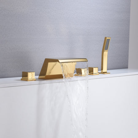 Waterfall Tub Filler Bathtub Faucet Polished Gold 5-Hole 3-Handle Solid Brass Bathroom Bath Tub Faucets Mixer Tap with Hand Shower