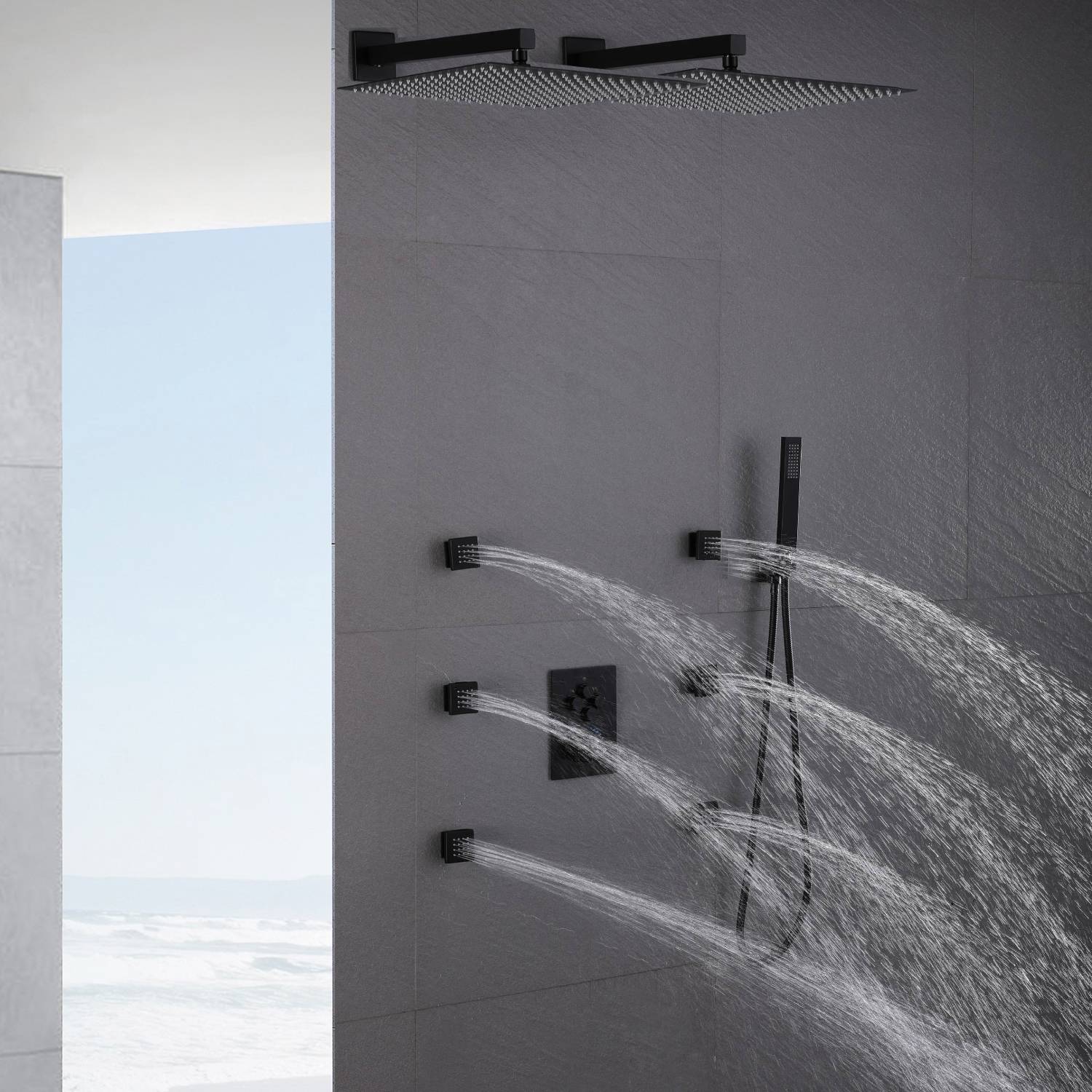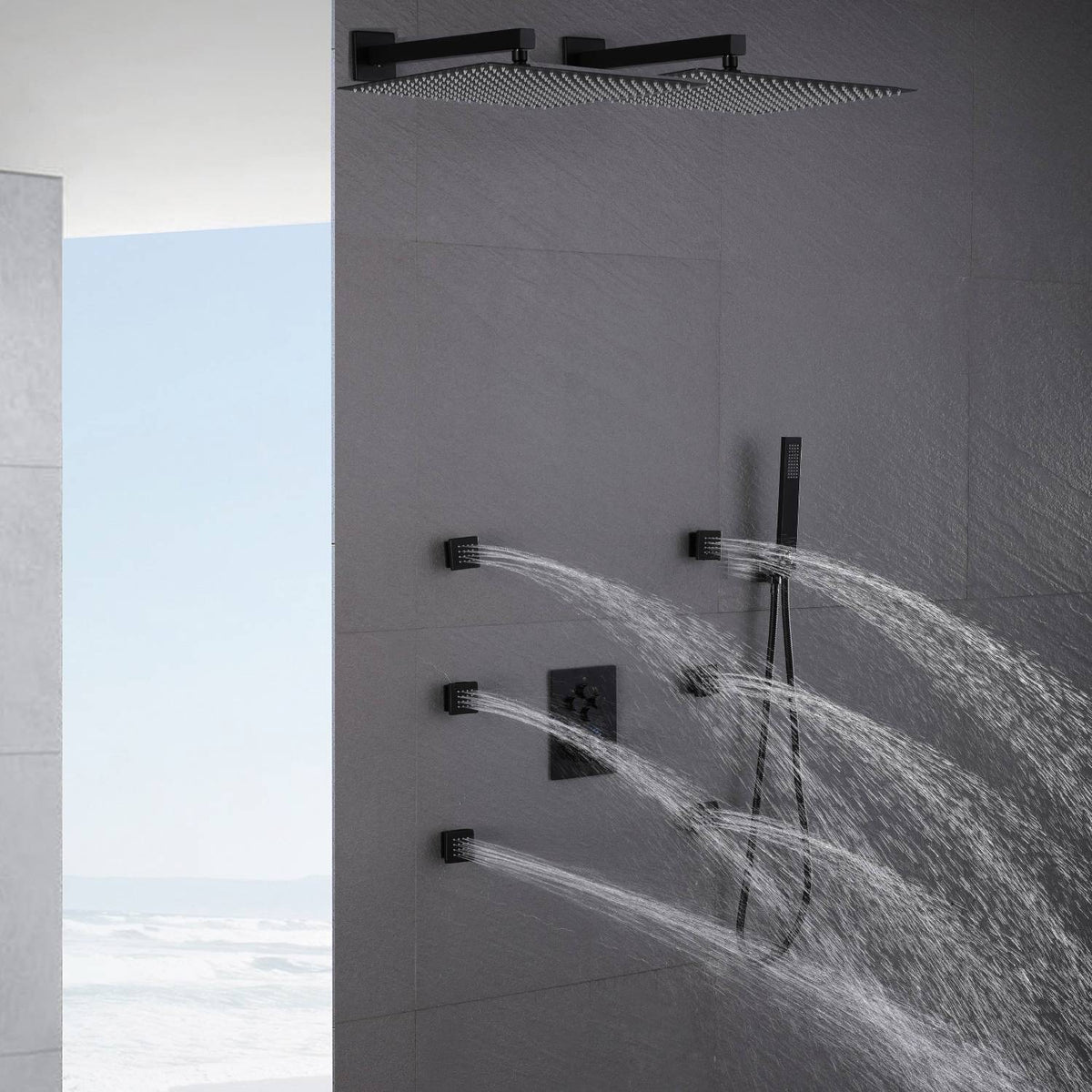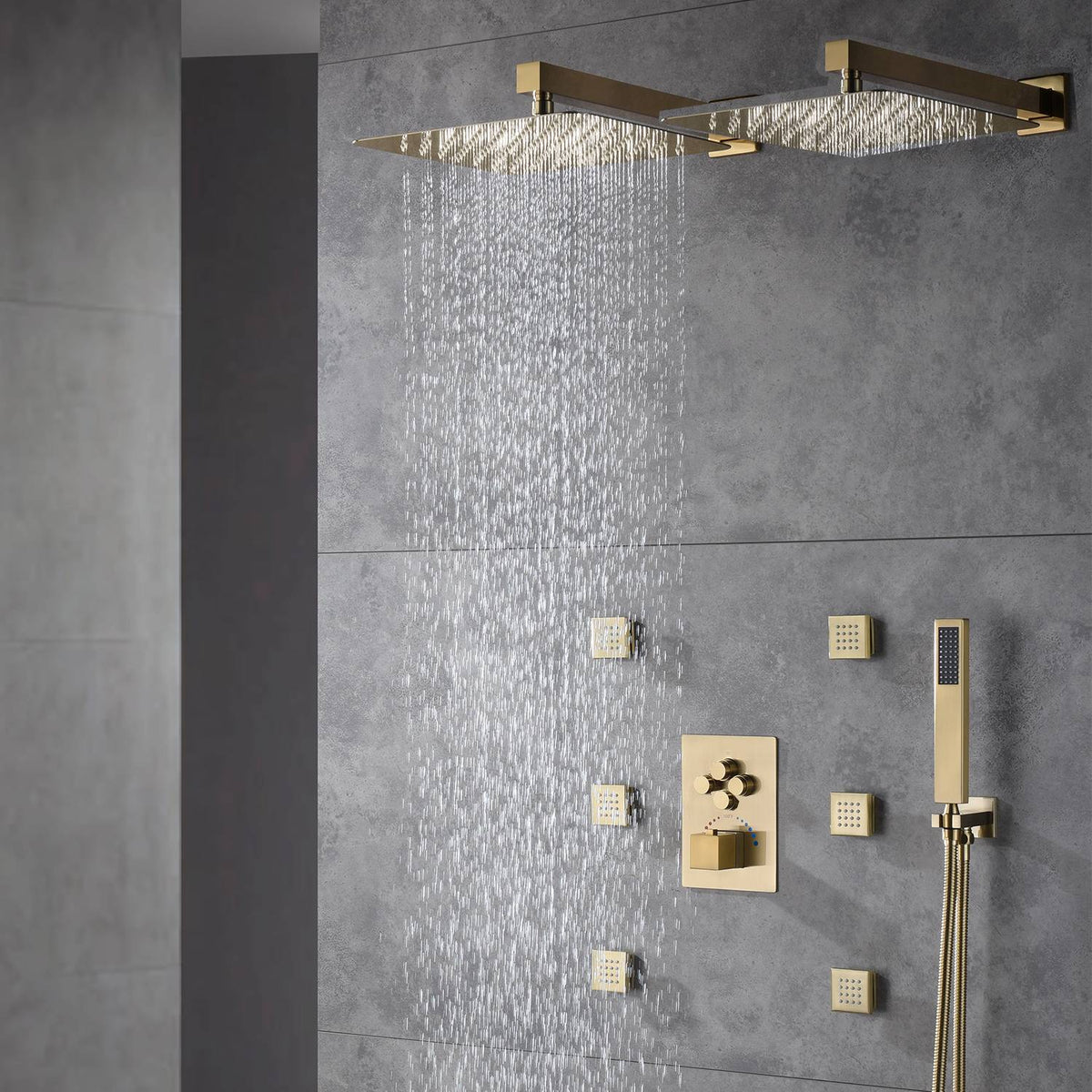 Simultaneous & Separate Functioning 4-Way Thermostatic Shower Faucet: Dual 12'' Rain Shower Heads with Body Jets, Available in 4 Finishing Colors