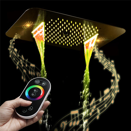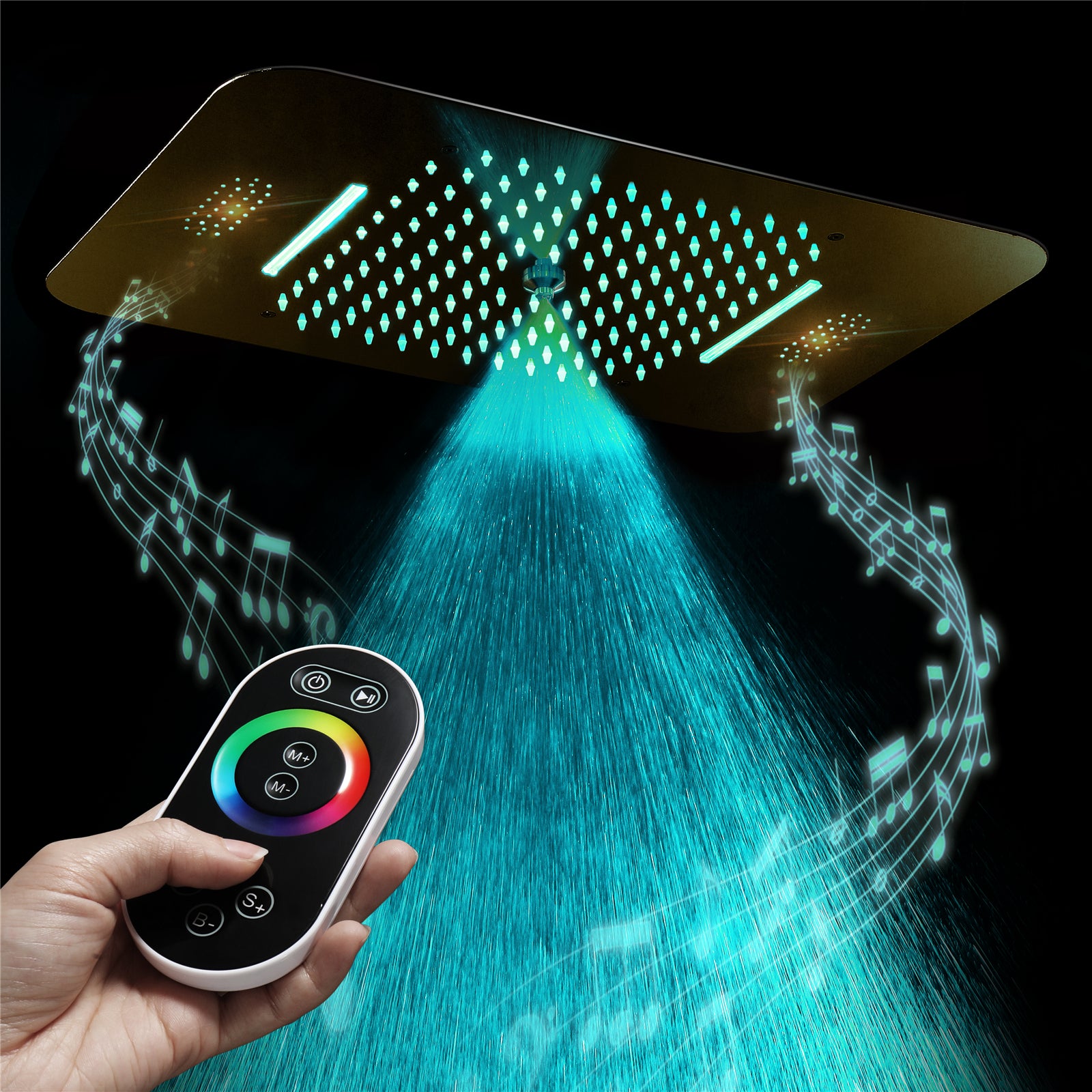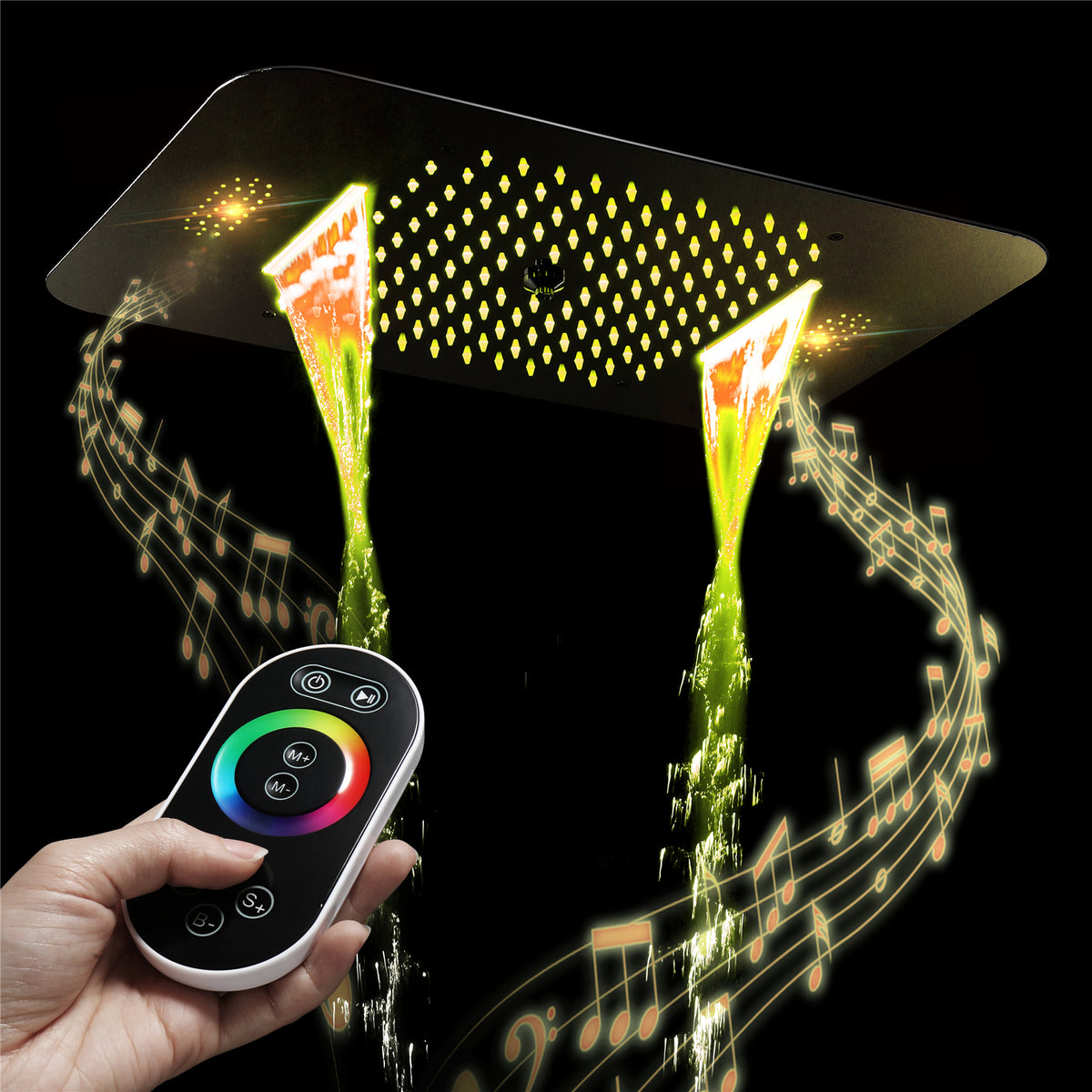 This 23" x 15" rainfall and waterfall mist shower head is crafted from 304 stainless steel, featuring a silica nozzle, G1/2" thread, and a water flow range of 2.5-7.5 GPM, with its 64-LED lighting and Bluetooth music capabilities powered by a transformer.