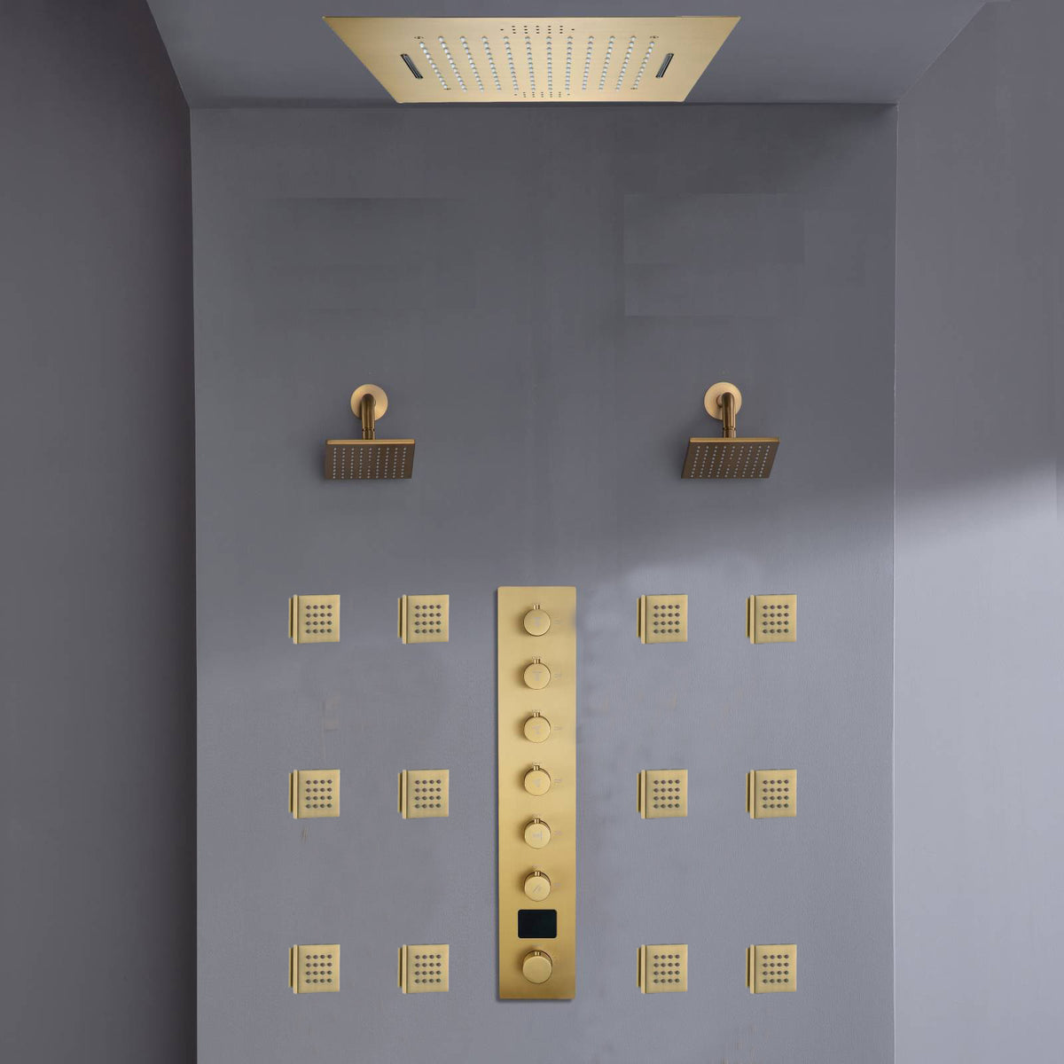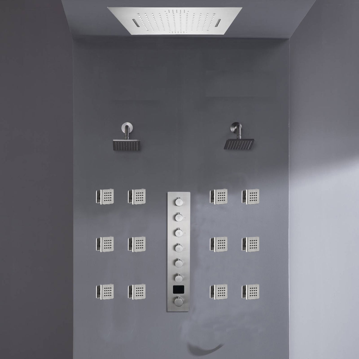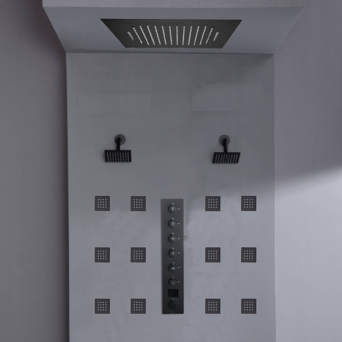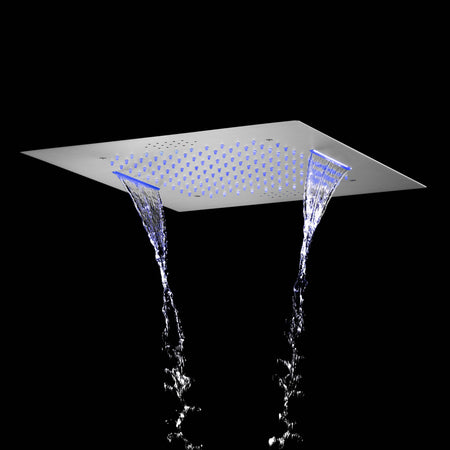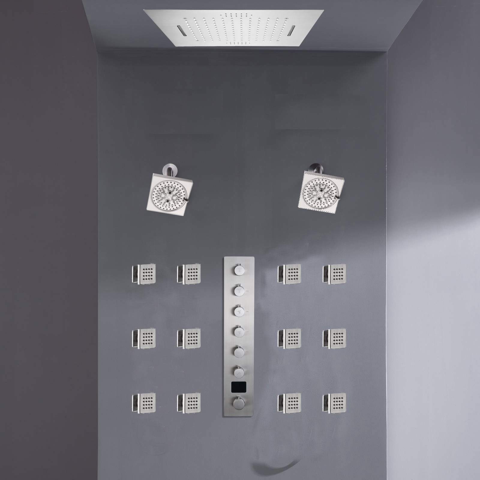 Flush mount 20 inch Rainfall Waterfall shower head 6 way Digital display thermostatic Shower Faucet with Dual Regular Heads and body jets