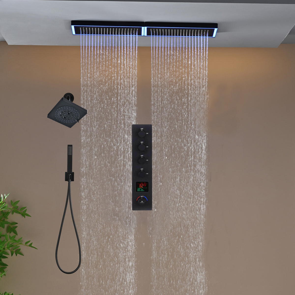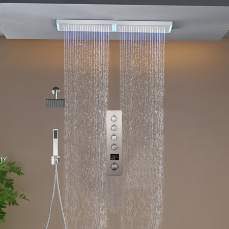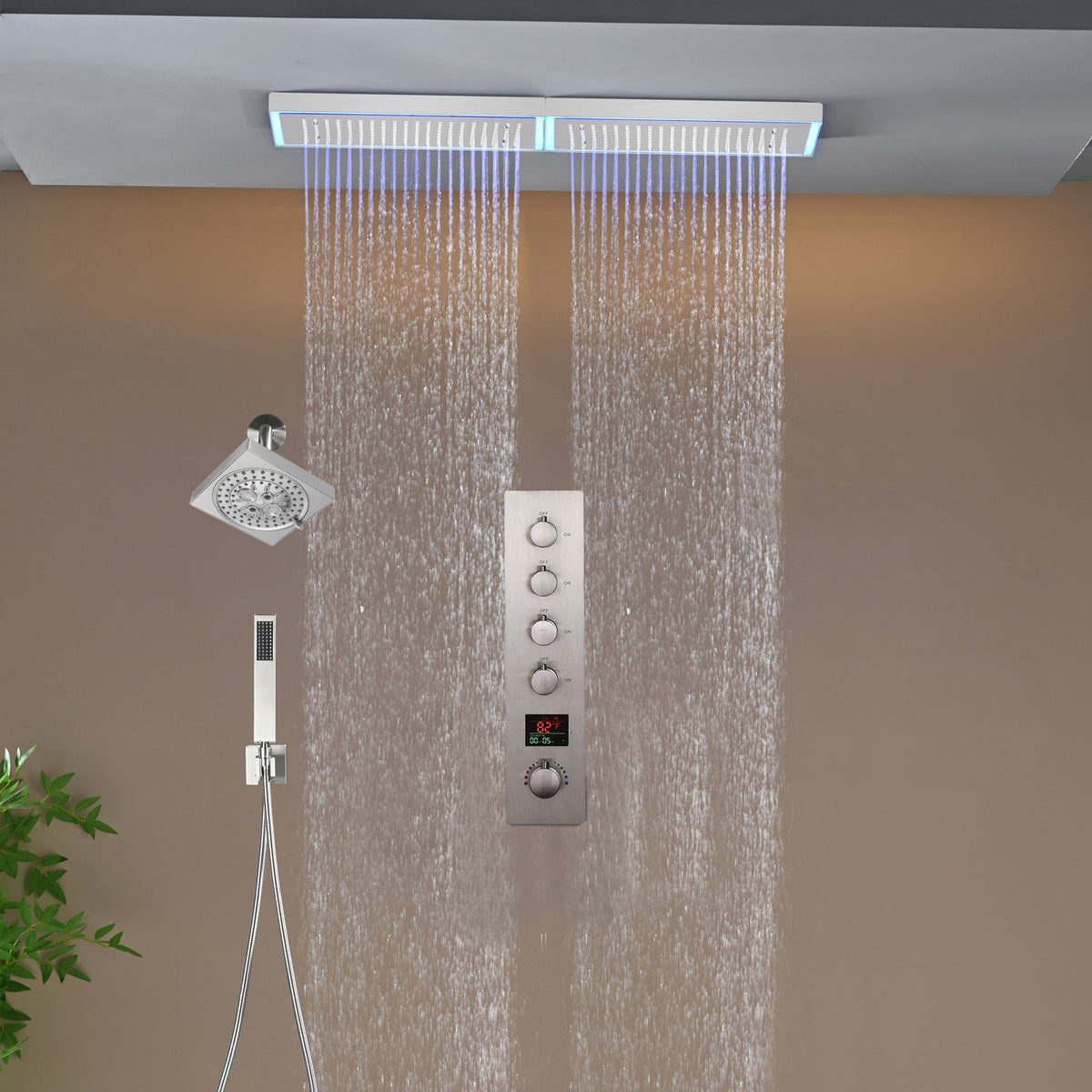Flush Mount 32 x 8 inch Rainfall 64 LED Light Shower Head with 4-Way Thermostatic Faucet and High-Pressure Regular Heads