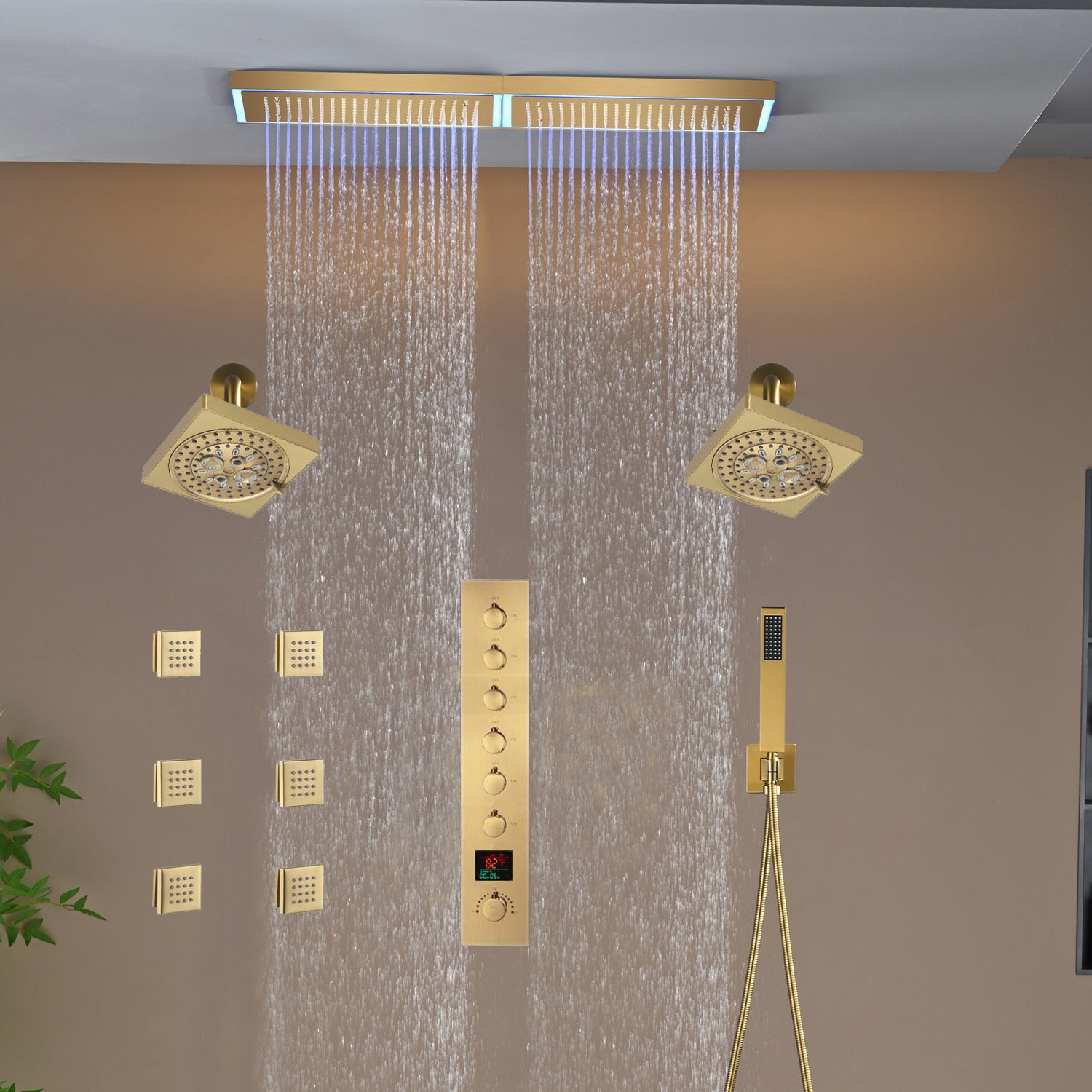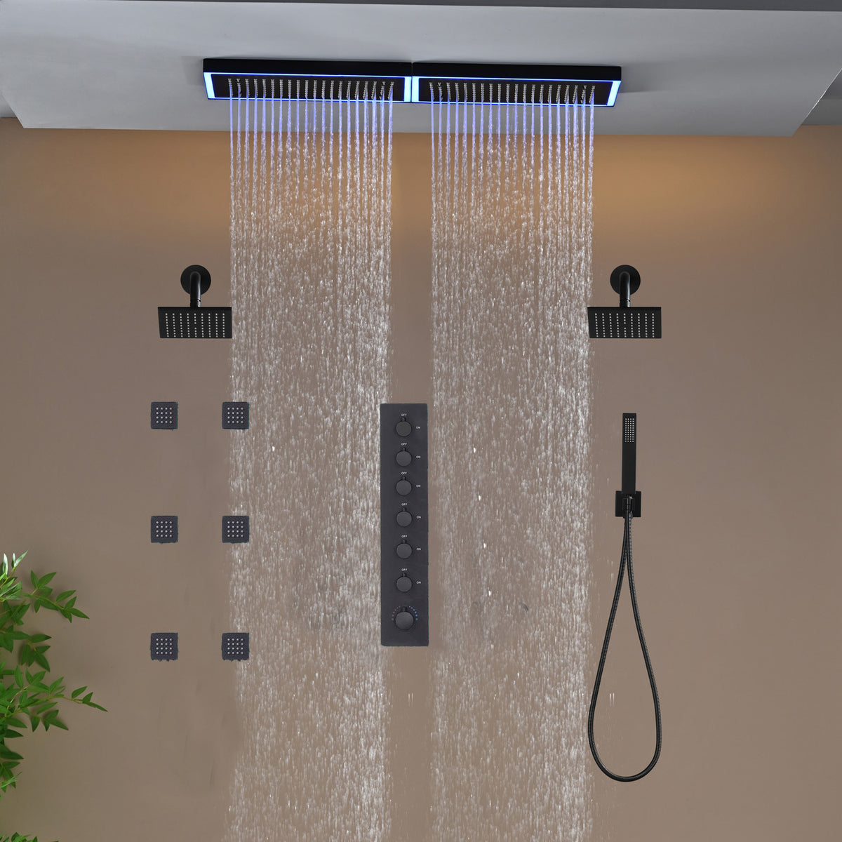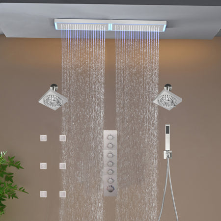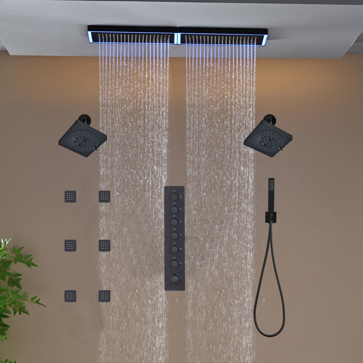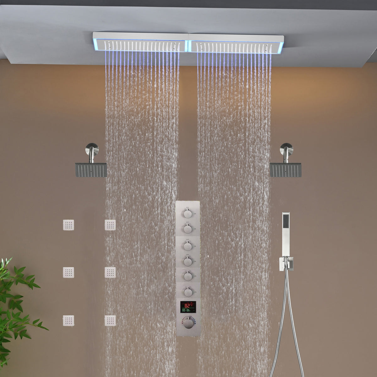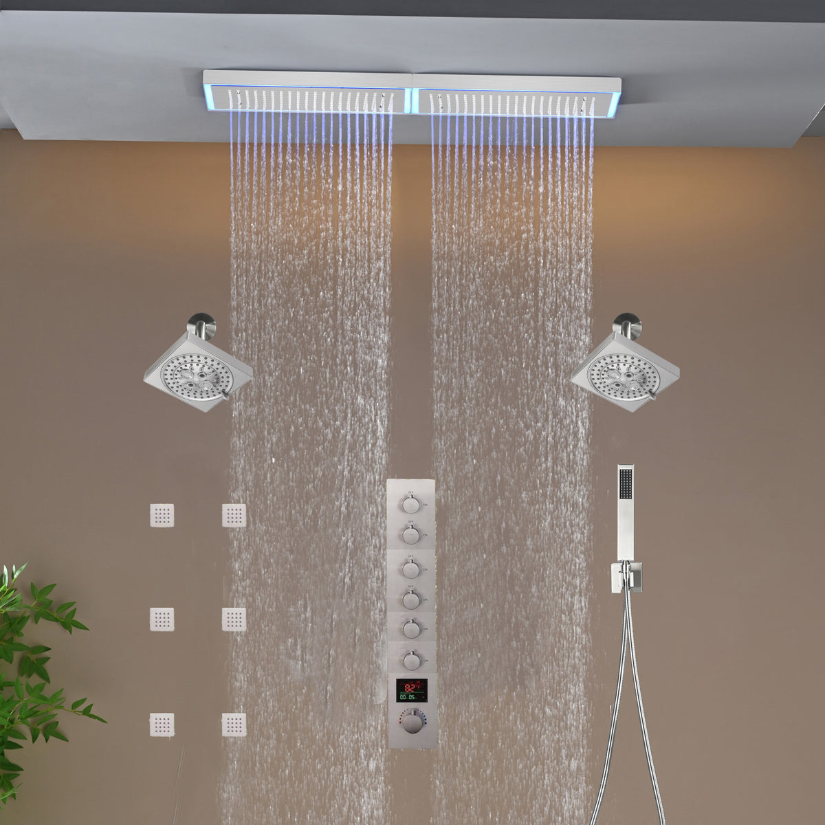 Flush Mount 32 x 8 inch Rainfall 64 LED Light Shower Head with 6-Way Thermostatic Faucet and High-Pressure Dual Regular Heads,6 body jets