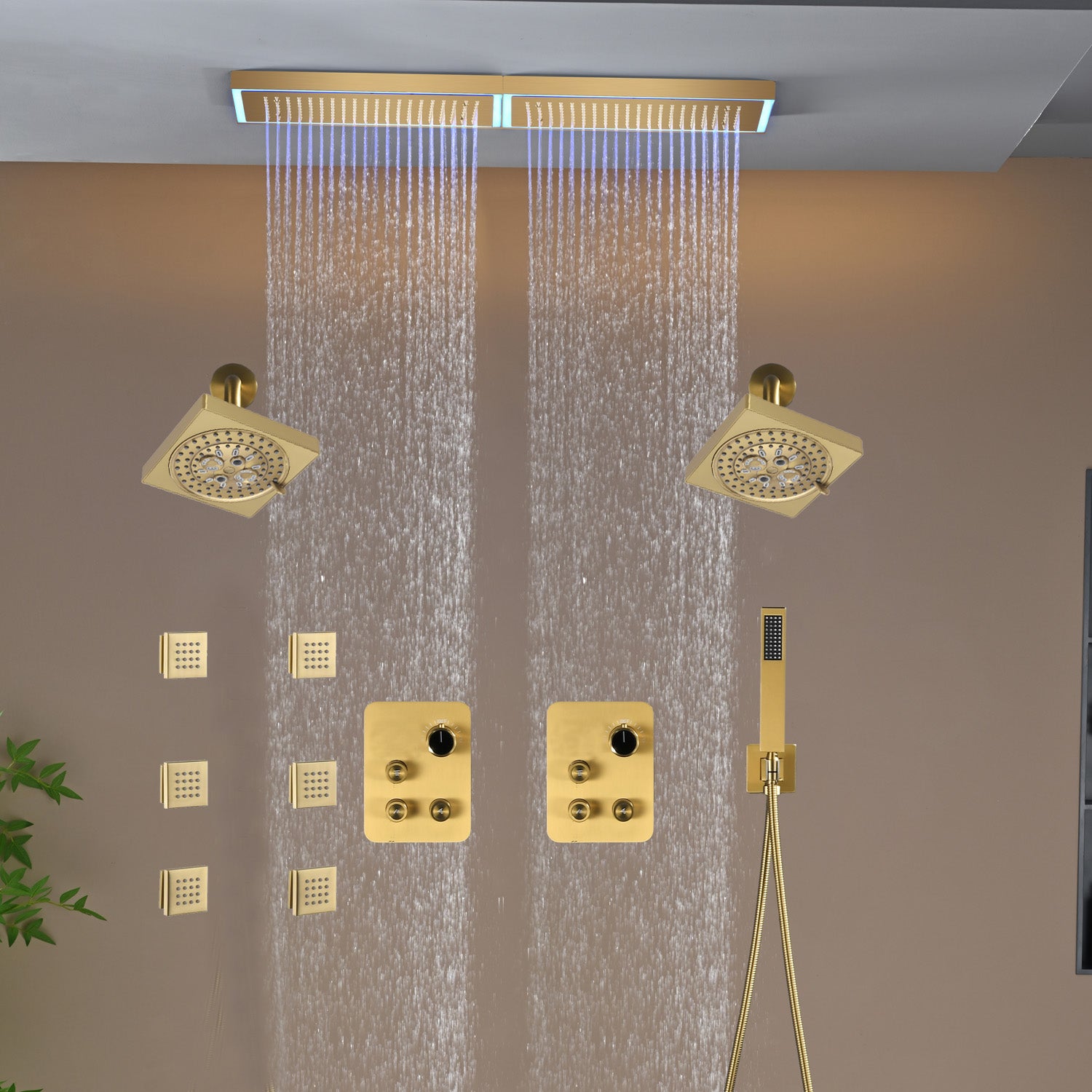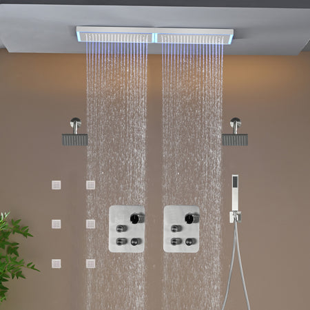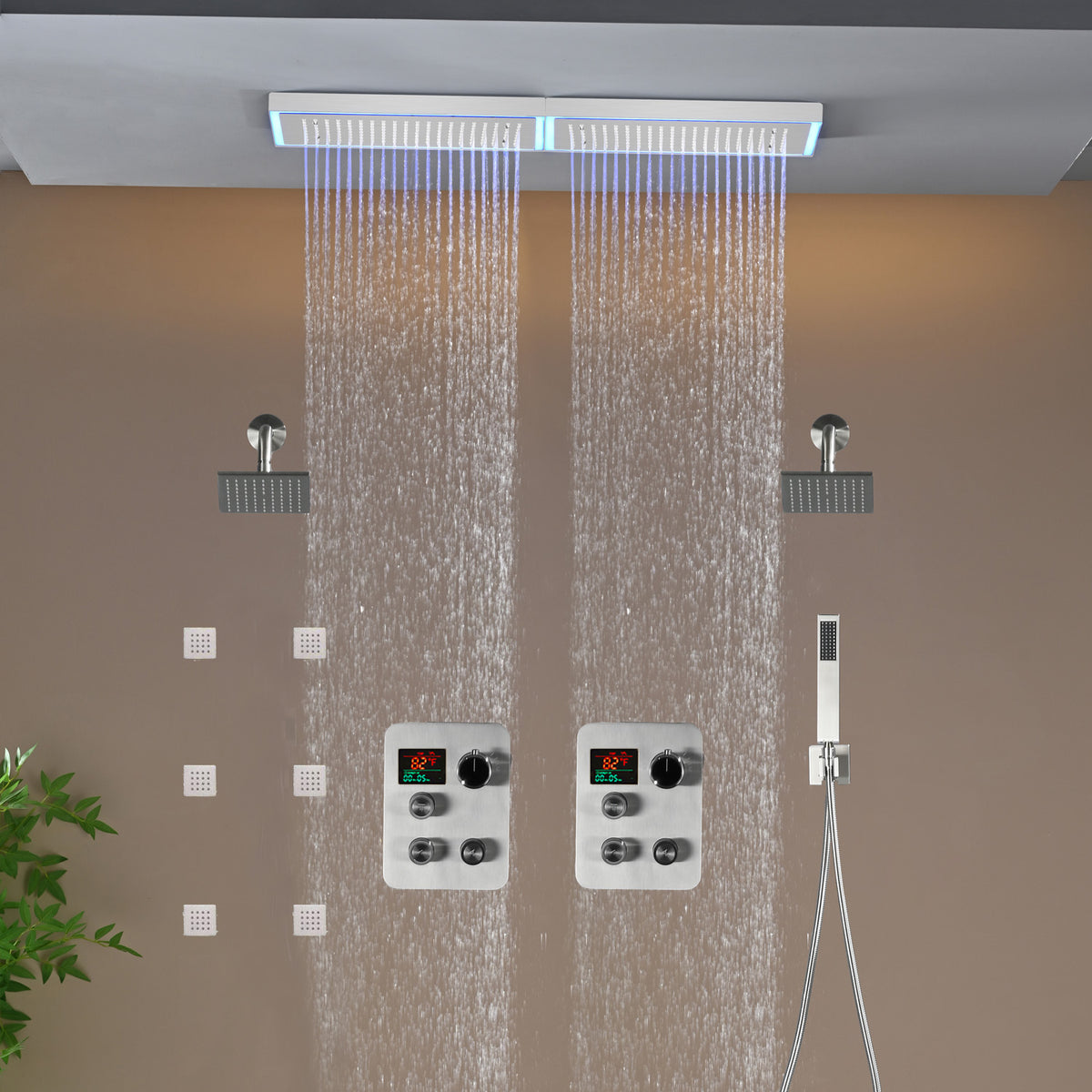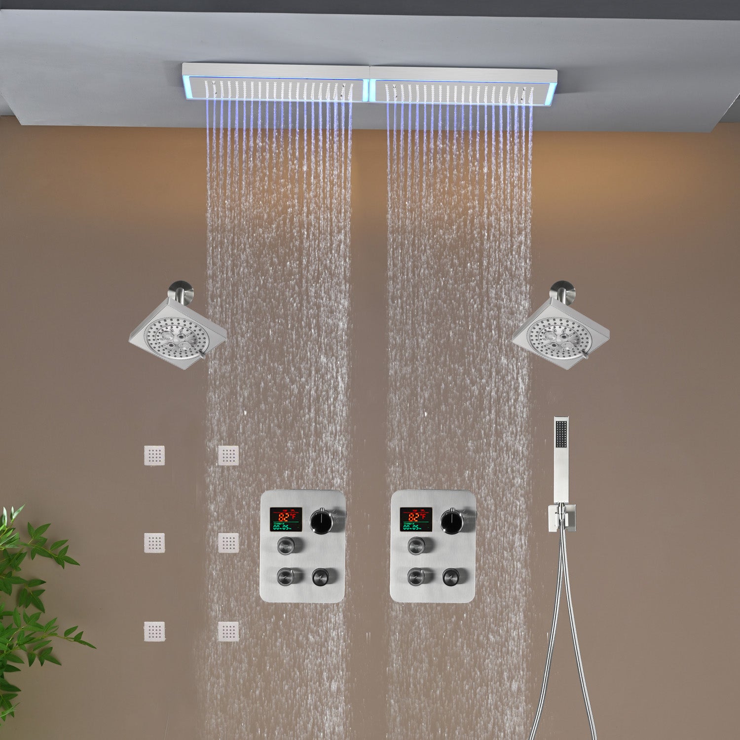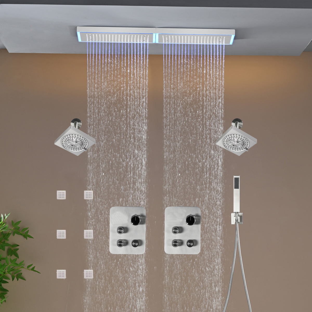 Flush Mount 32 x 8 inch Rainfall 64 LED Light Shower Head with 6-Way Thermostatic Faucet and High-Pressure Dual Regular Heads,6 body jets