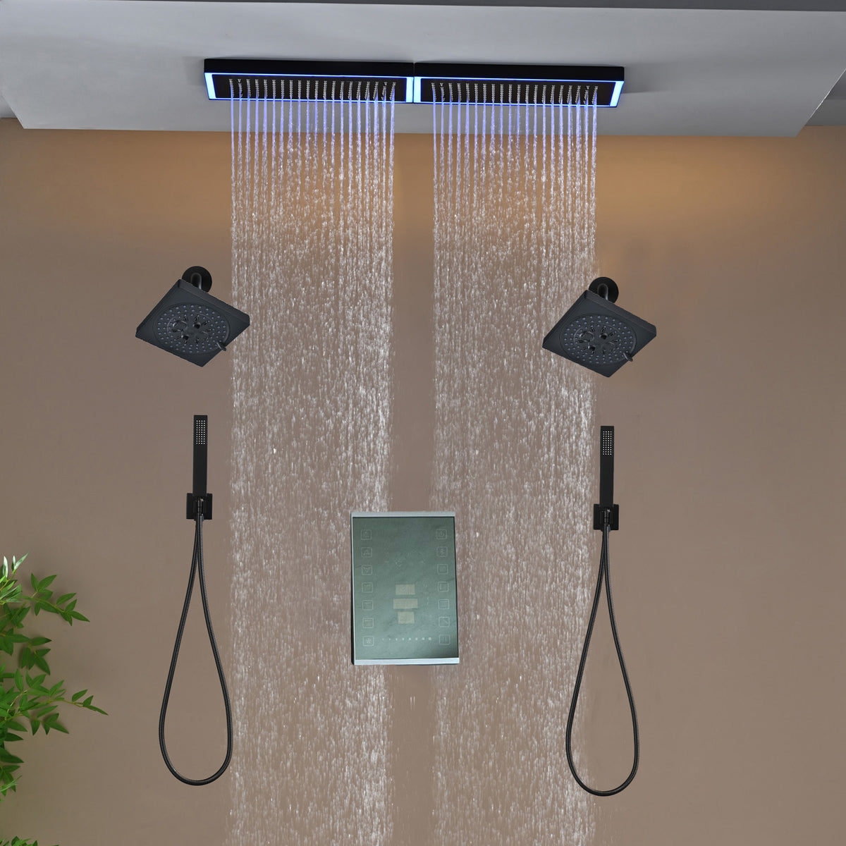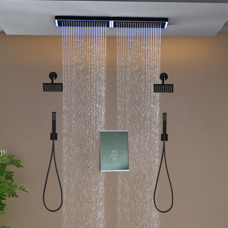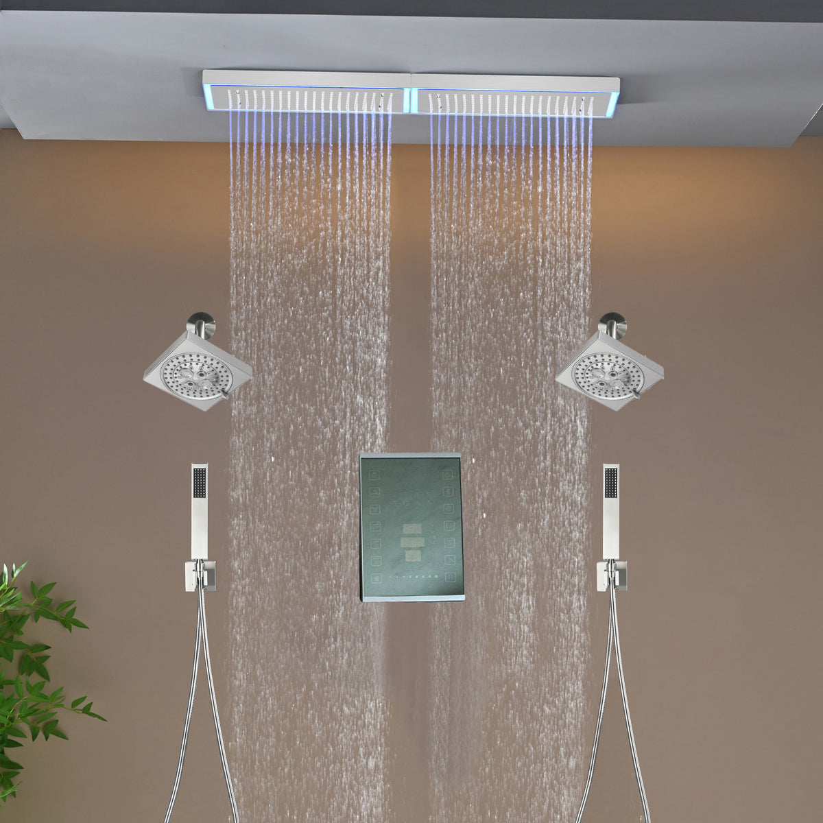 Flush Mount 32 x 8 inch Rainfall 64 LED Light Shower Head with 6-Way Digital display touch panel Thermostatic Faucet and High-Pressure Regular Heads