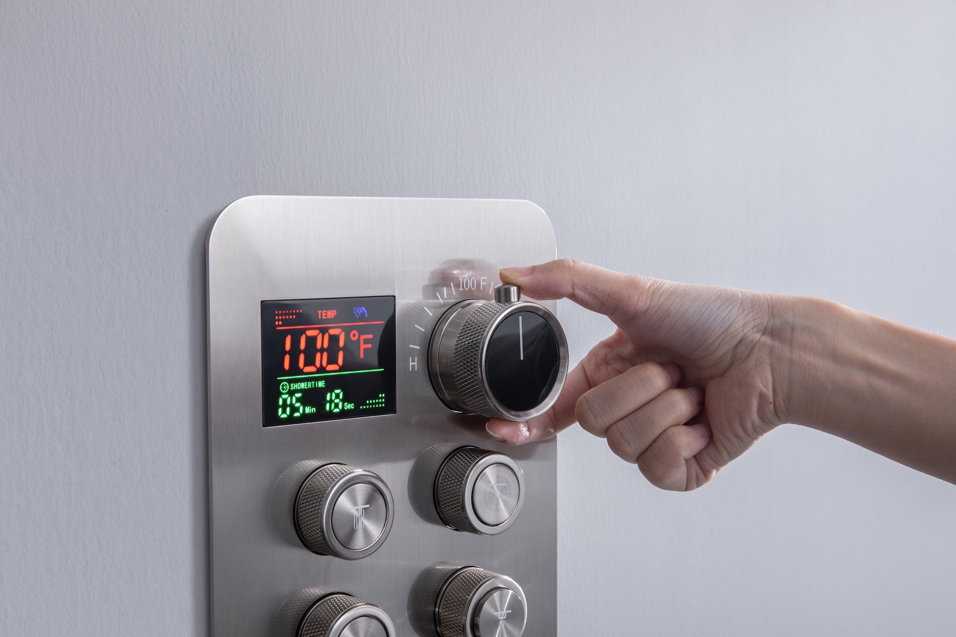 Six-Function Thermostatic Valve: This feature allows all functions to work simultaneously or separately, offering a customizable shower experience. The thermostatic valve maintains a constant, desired water temperature, ensuring your safety with an anti-scald feature.The digital display for the faucet is optional and operates solely through water flow, eliminating the need for batteries. it features a digital display and push buttons for adjusting water flow and pressure, accommodating 1/2 inch or 3/4 inch hot and cold water pipelines, with a high water flow range of 1.5 to 7.8 GPM.