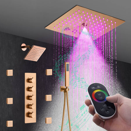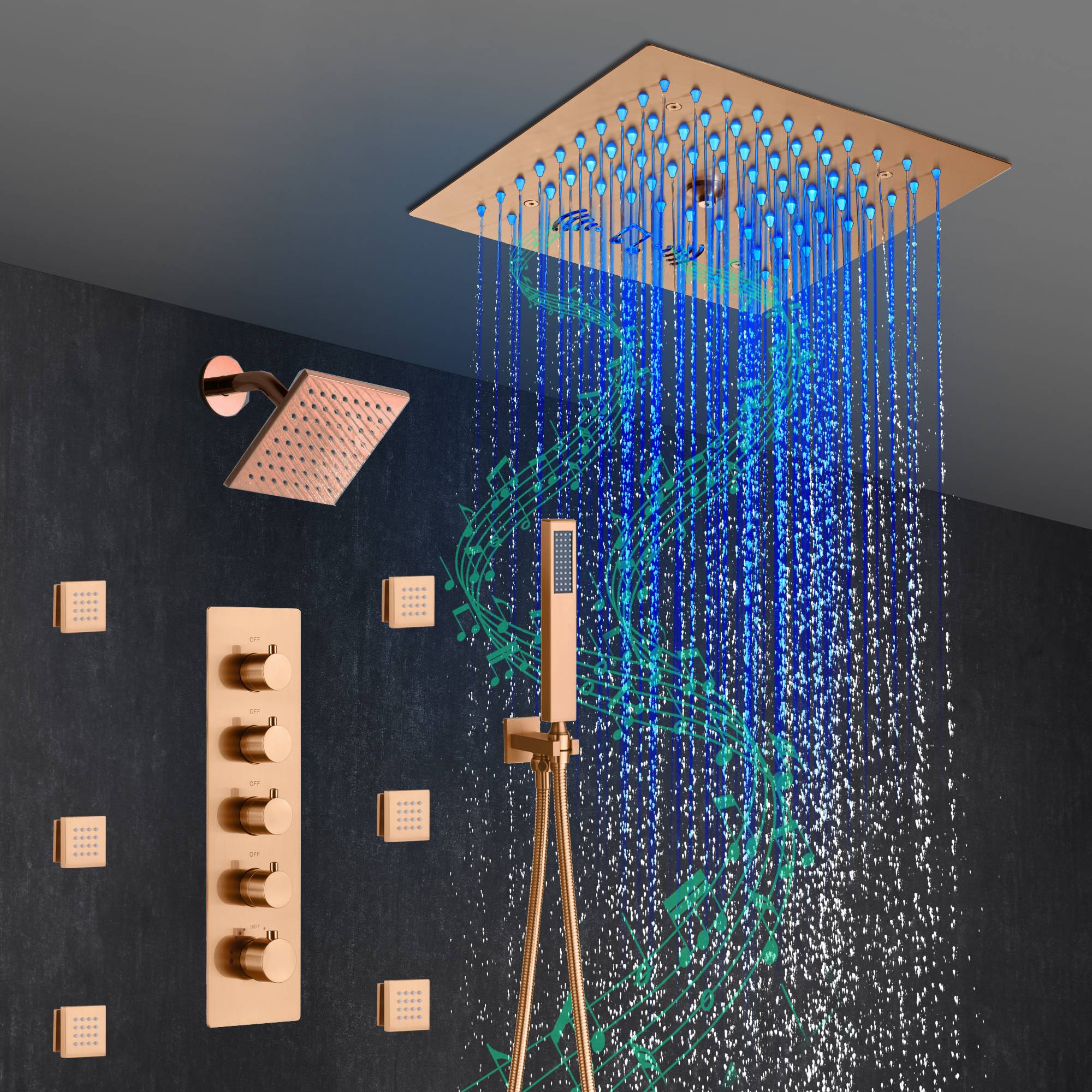 12" Rose Gold LED Bluetooth Music Shower System with 4-Way Thermostatic Faucet, Body Jets, 6" Regular Head