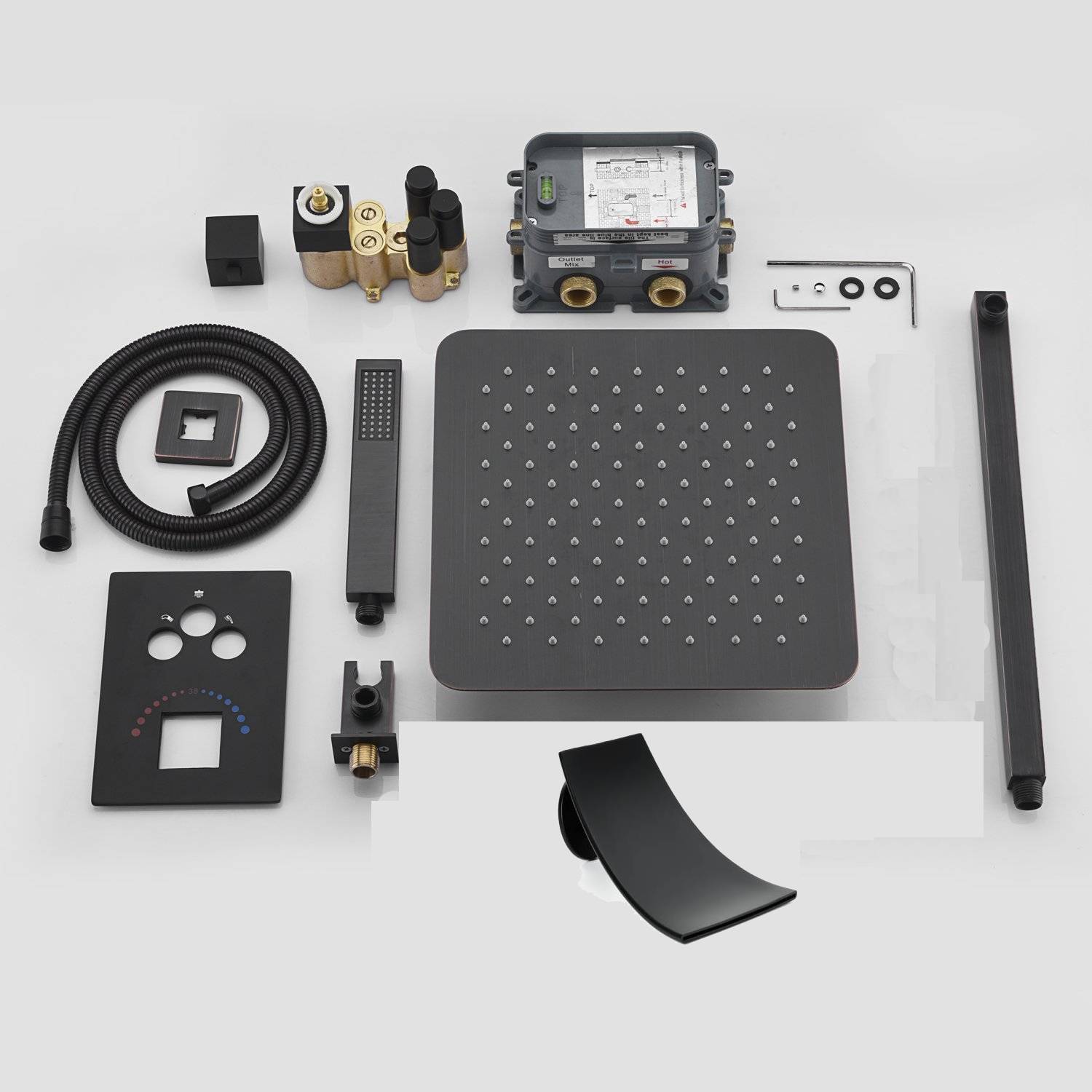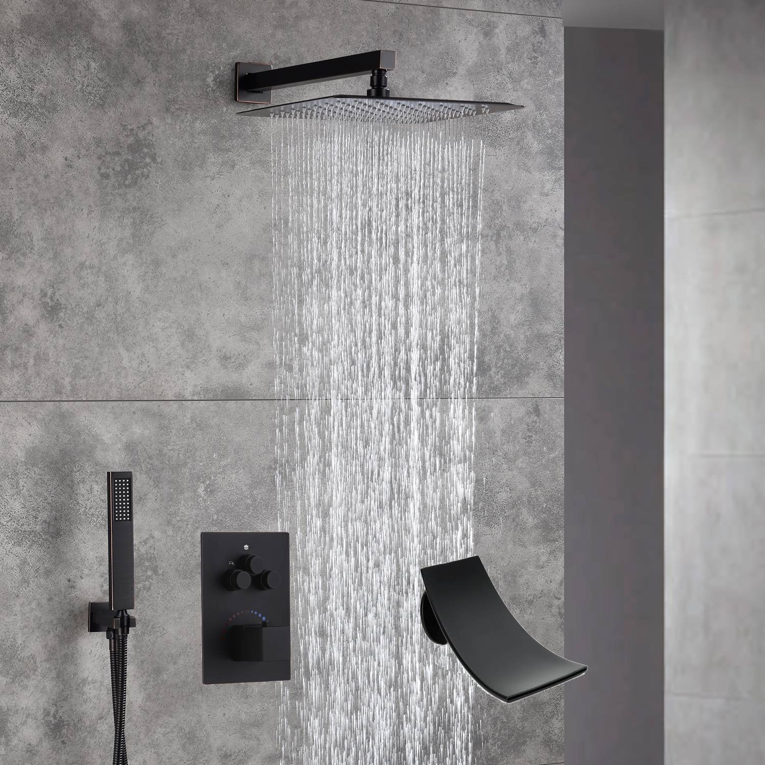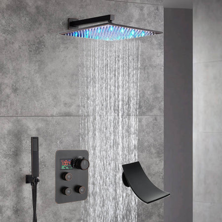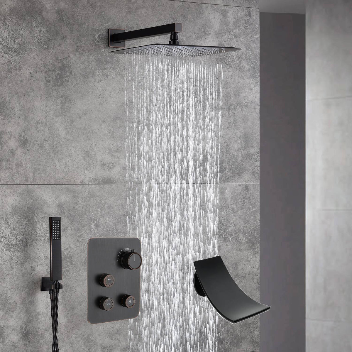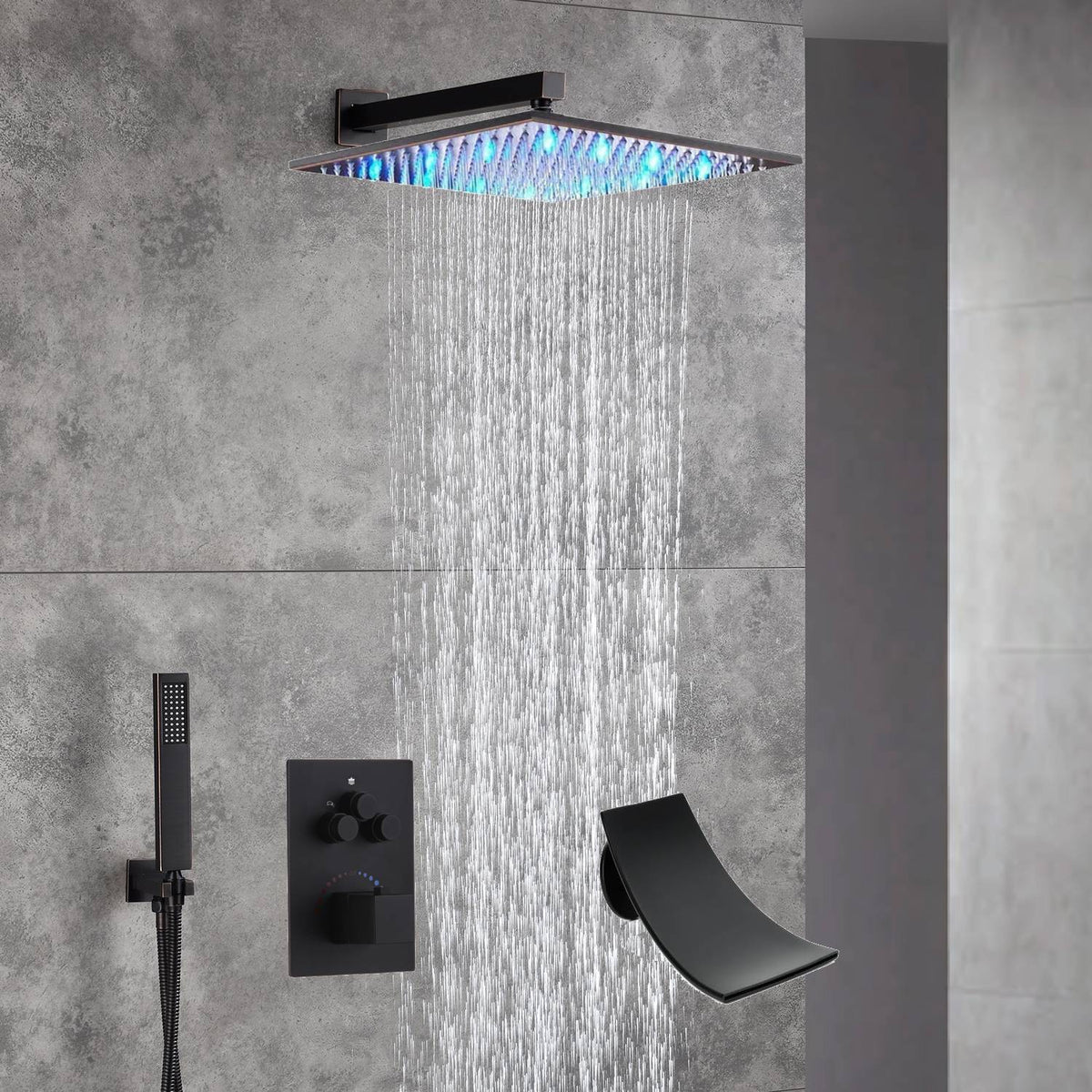12-Inch Wall Mounted Oil Rubbed Bronze 3-Way Thermostatic Shower Faucet System:LED or Non-LED Options, Simultaneous and Independent Functions with Waterfall Tub Spout