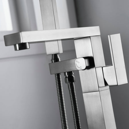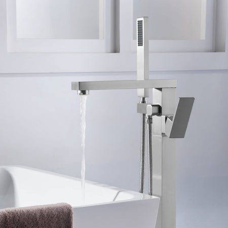 Experience Luxury and Functionality with our Brushed Nickel Waterfall Floor Mount Freestanding Bathtub Faucet Tub Filler: Featuring a Ceramic Cartridge Valve, Elegant Design, and Enhanced Water Flow.