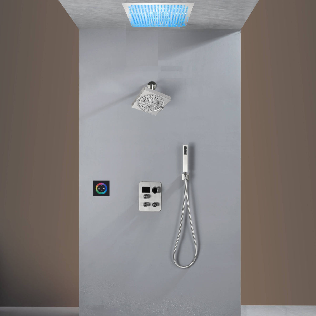 2. 64 LED Light Shower Head: The 16" x 16" or 20'' x 20'' or 24'' x 24'' shower head is equipped with  64 LED color lights. This feature adds a vibrant display and your favorite tunes to your shower time. Touch Panel is to control 64 LED light;