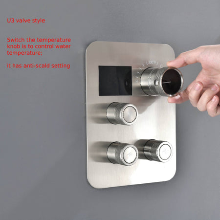 Transform your shower time into an immersive sensory experience with our 3-function thermostatic valve shower system. This luxurious shower system integrates LED and Music into the shower head, creating a unique video display that adds a touch of sophistication and fun to your bathroom.