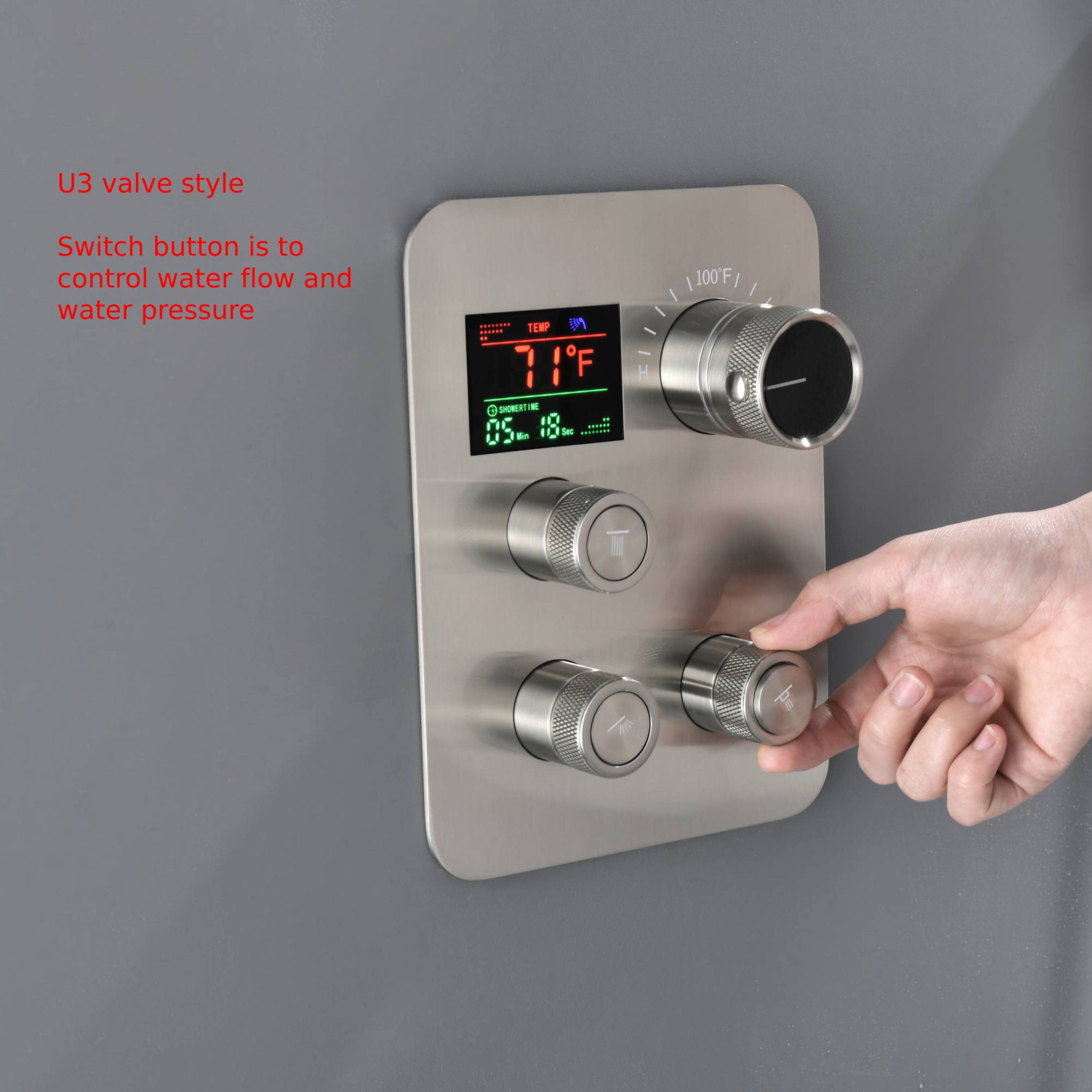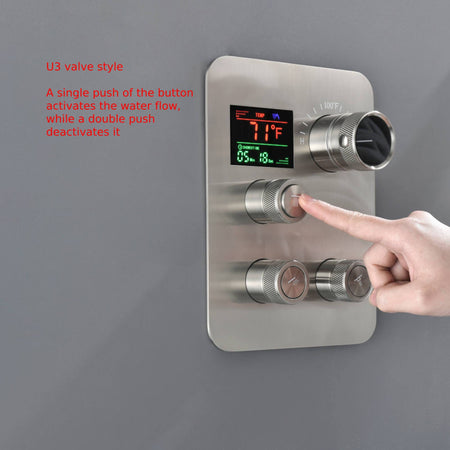 The U3 valve style features a digital display and push buttons for adjusting water flow and pressure, accommodating 1/2 inch or 3/4 inch hot and cold water pipelines, with a high water flow range of 2.5 to 7.8 GPM.