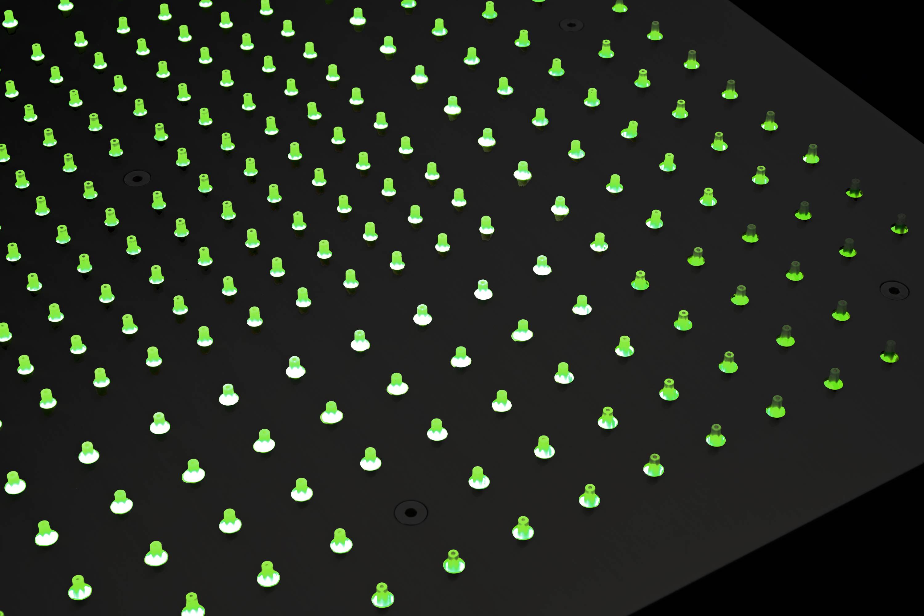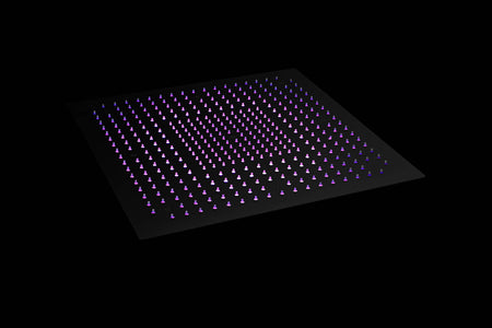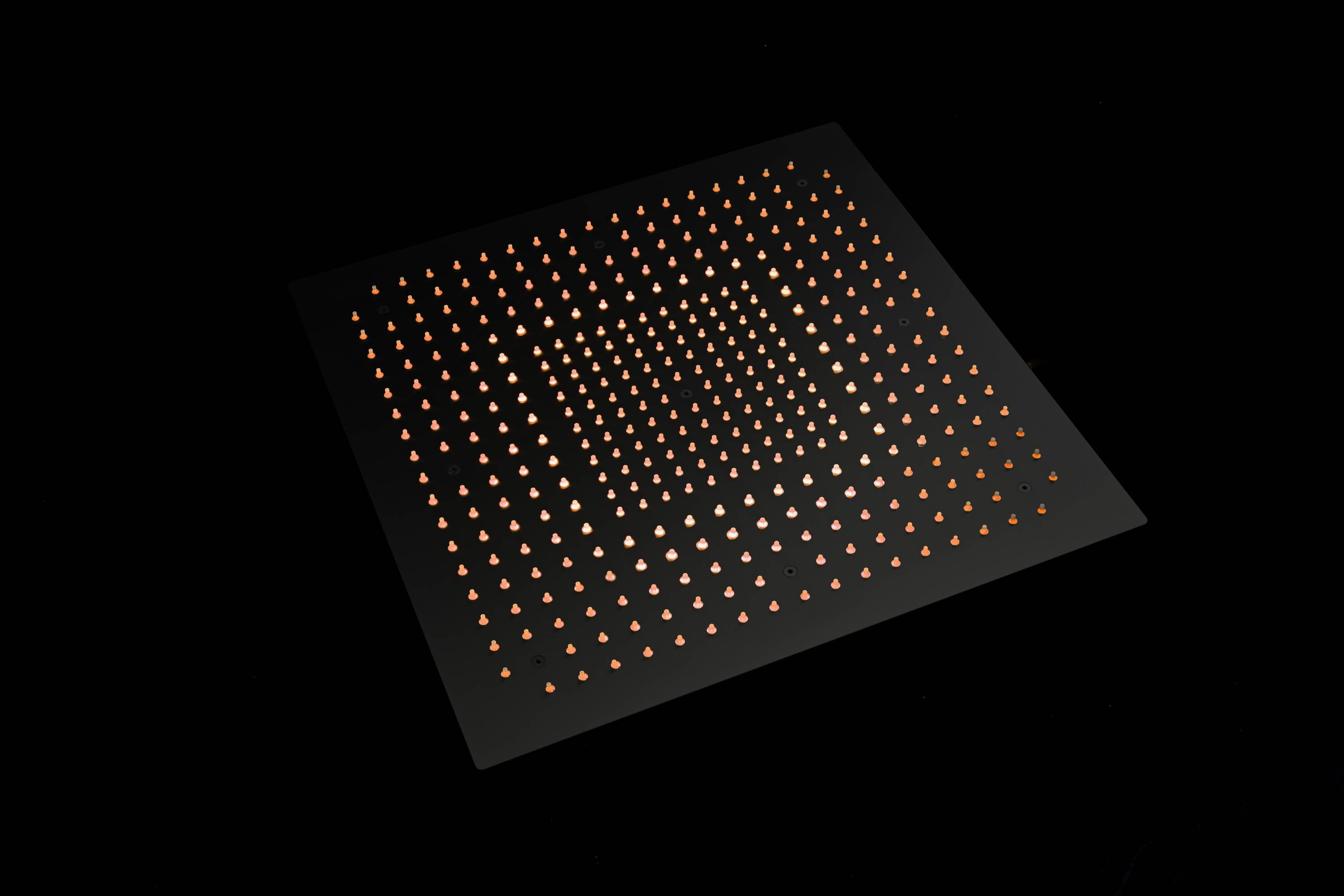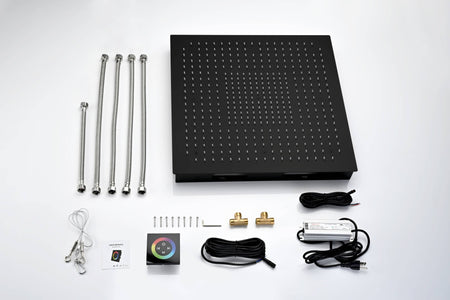 The system includes a large 20 x 20 inch rainfall shower head, complete with 64 LED lights that can be controlled by a touch panel. You can turn the lights on or off as you shower, personalizing your experience. The LED lights are powered electronically and offer manual operation, allowing you to select from 64 different colors.