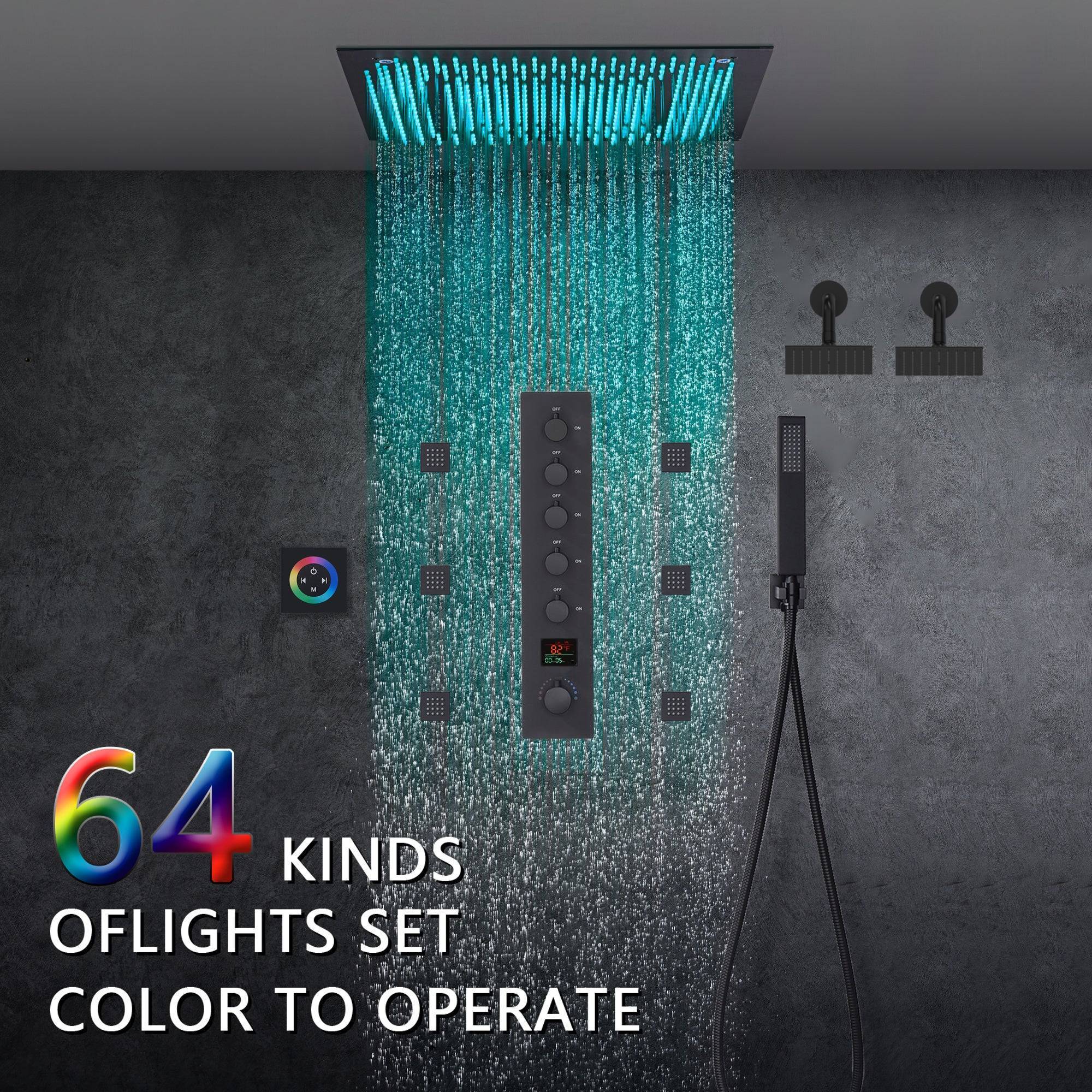 Matte Black 20" Rainfall Shower System with LED, 5-Way Thermostatic Valve, Dual Heads, 6 Jets