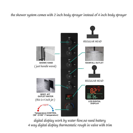 Experience the ultimate in shower luxury with this sophisticated matte black thermostatic shower system. It features a 5-way thermostatic valve with two options: a non-digital display rough-in valve with trim or a digital display rough-in valve with trim. The digital display is powered by water flow, eliminating the need for batteries.