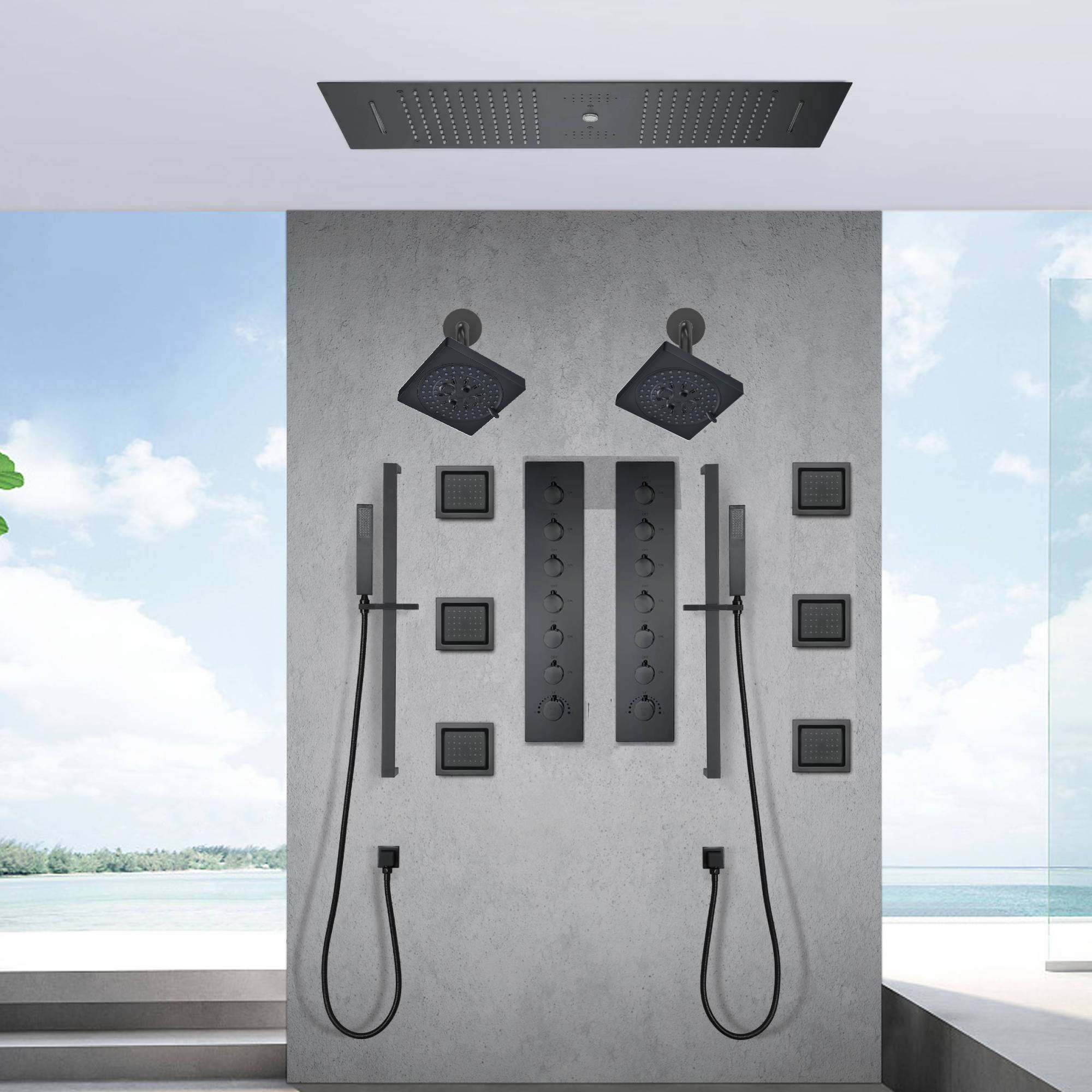 Matte Black 35" Bluetooth Music LED Shower System with Waterfall, 6-Way Digital Thermostatic Valve, 6 Body Jets, Dual Regular Heads