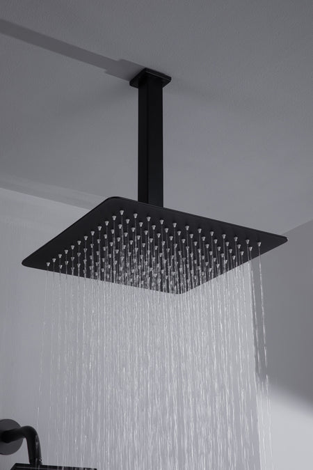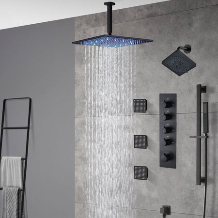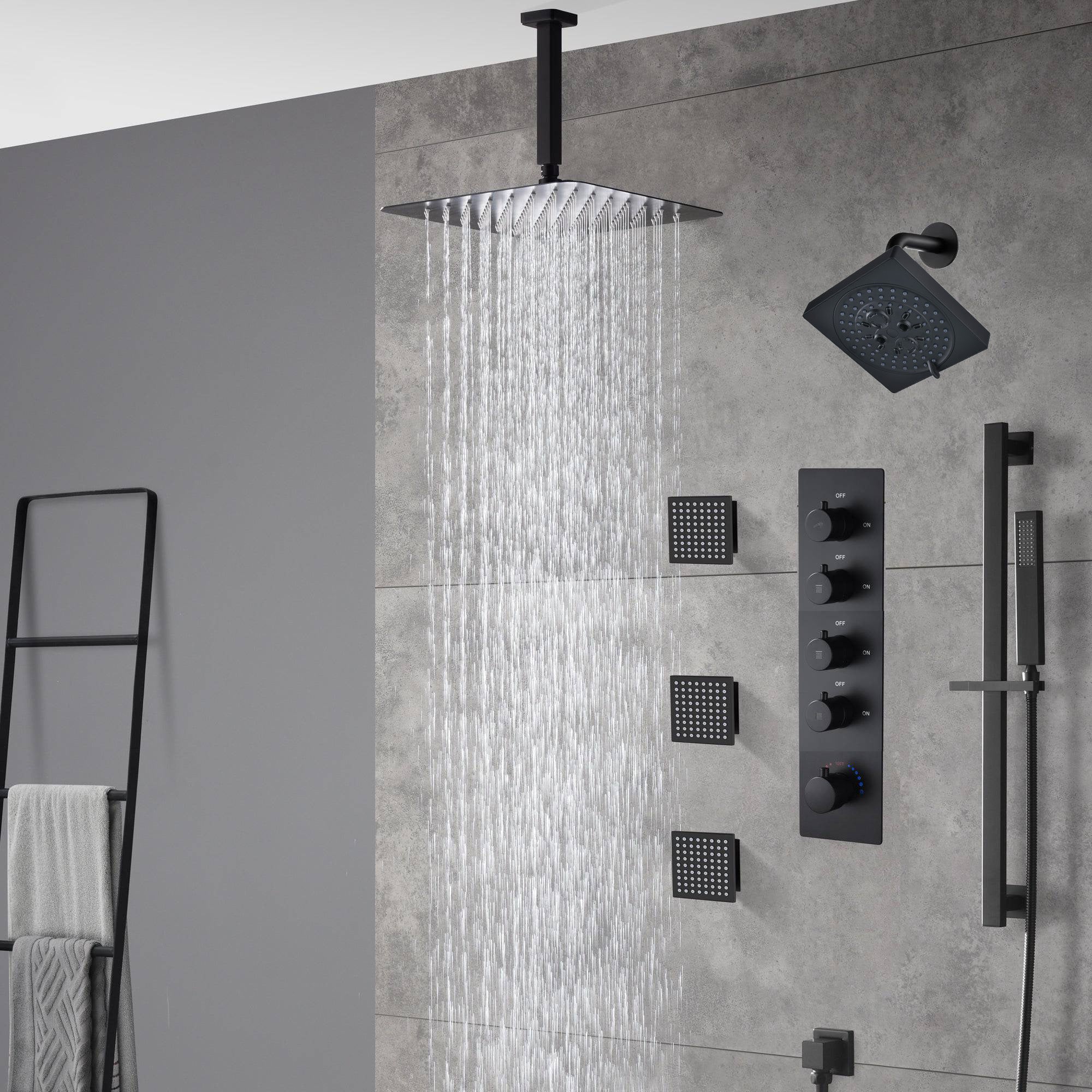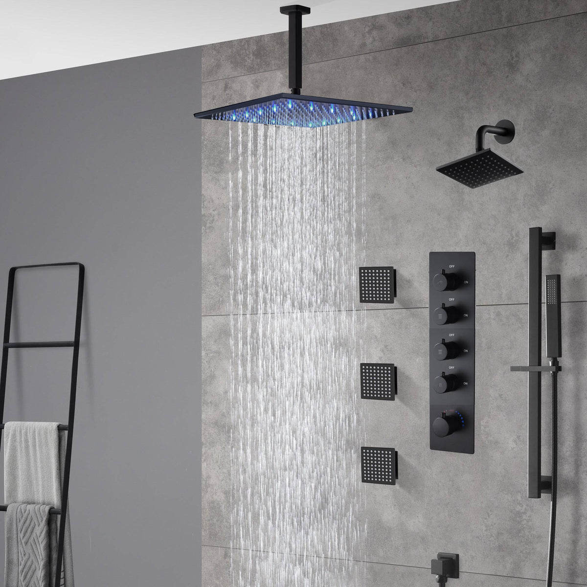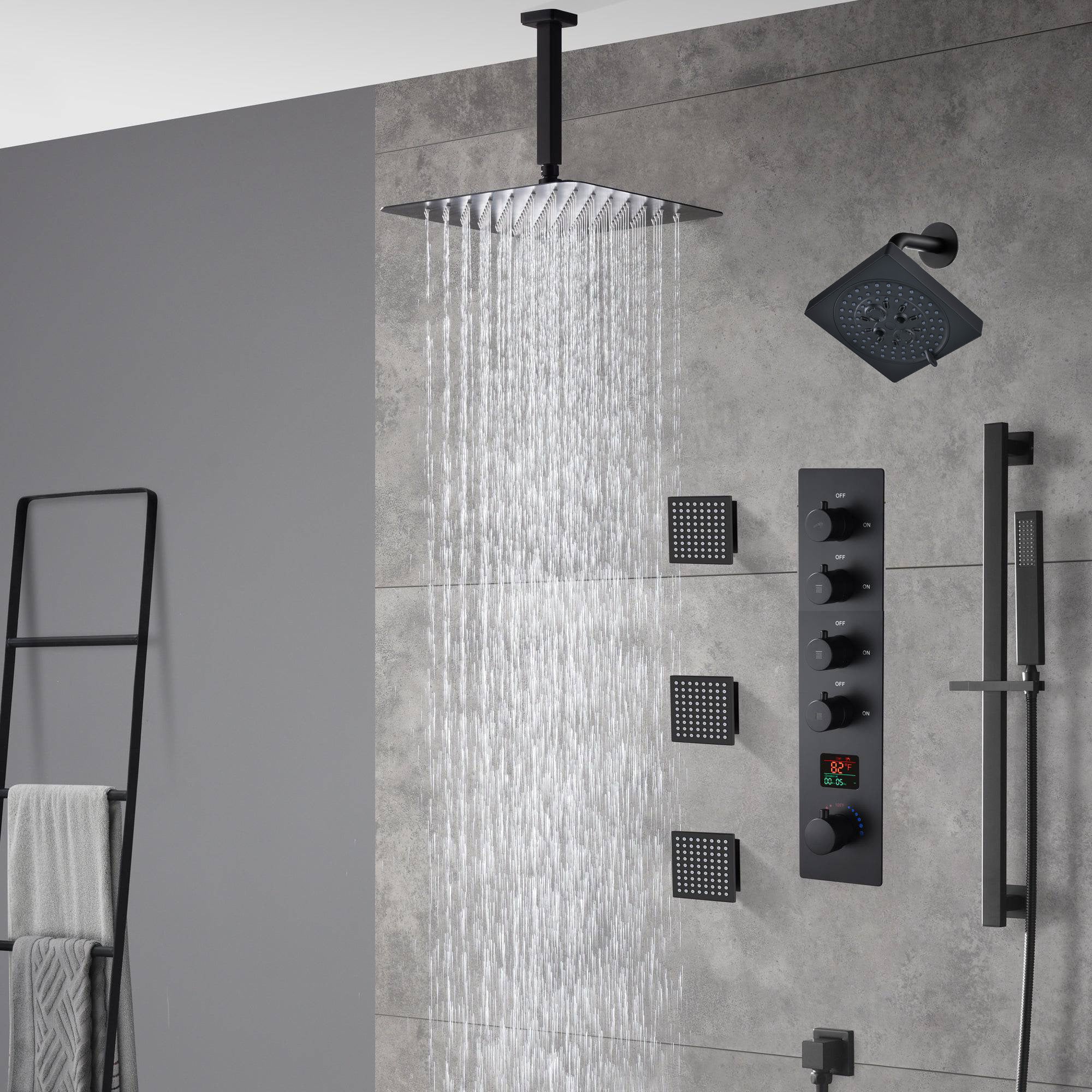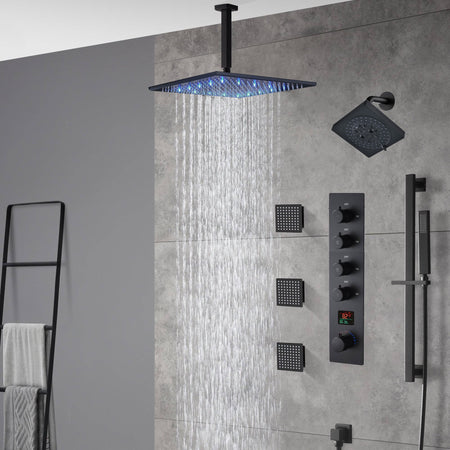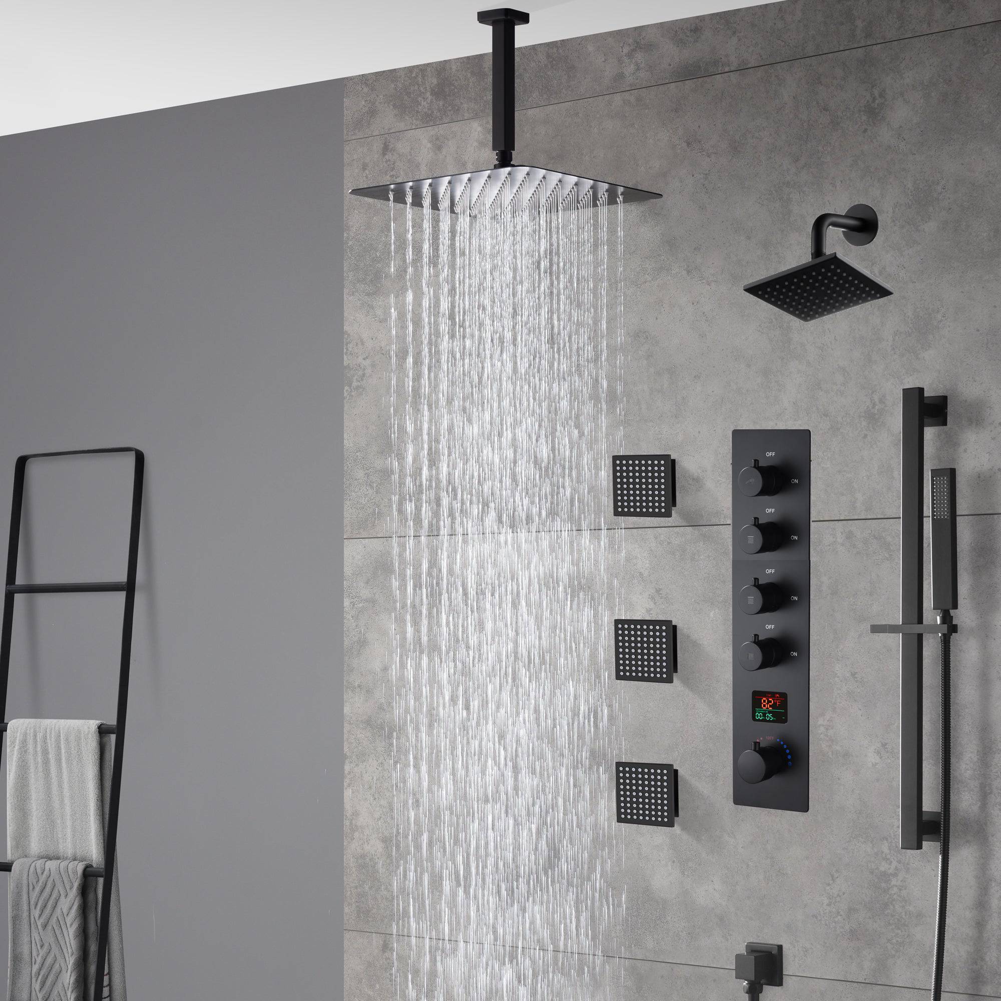 Matte Black Ceiling-Mounted 4-Way Digital Thermostatic Shower System with Regular and Rainfall Heads 12'' or 16'', Optional LED Light Feature
