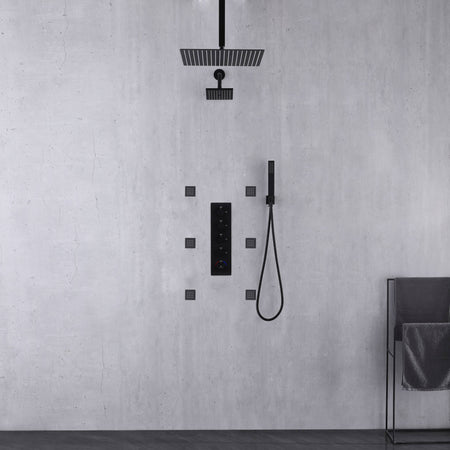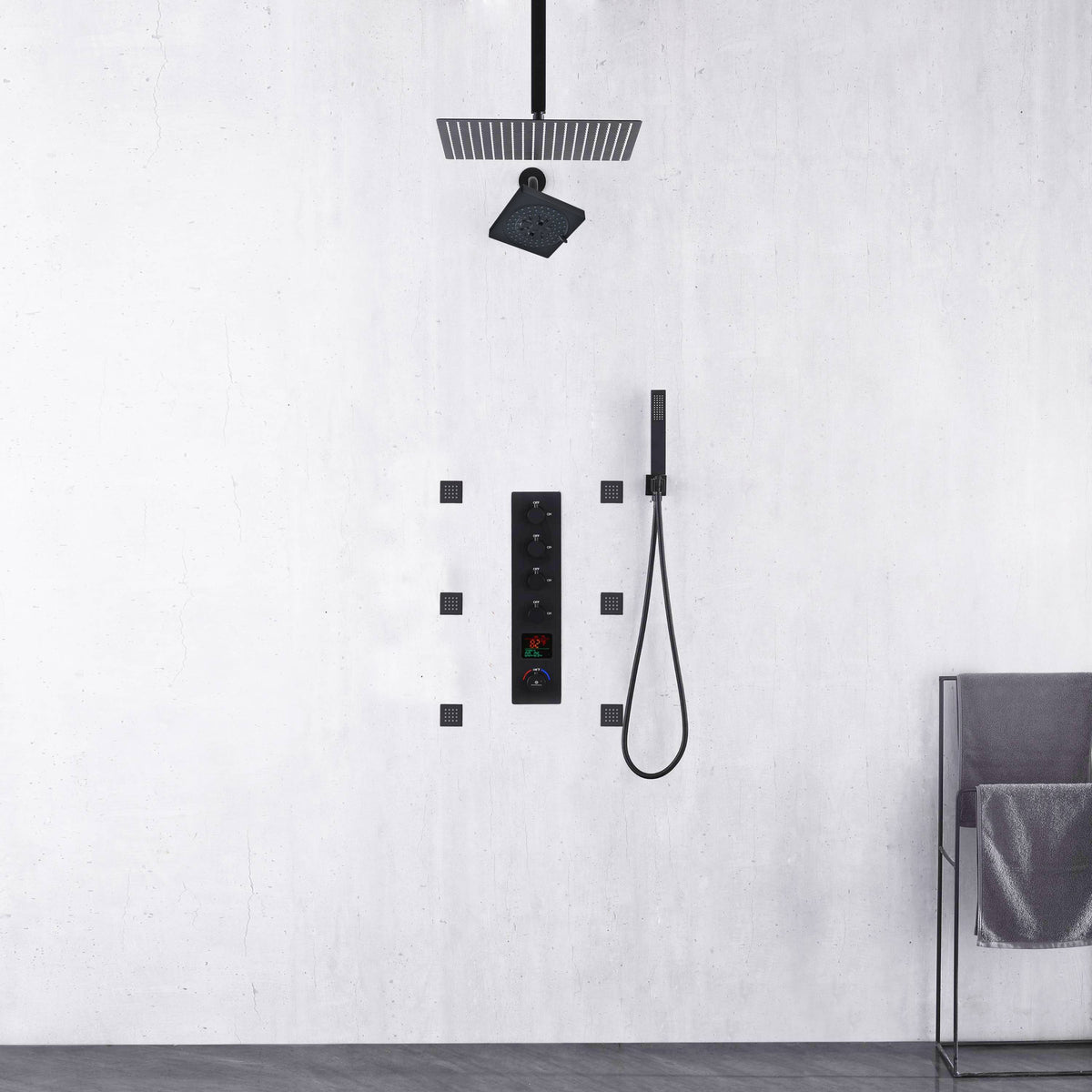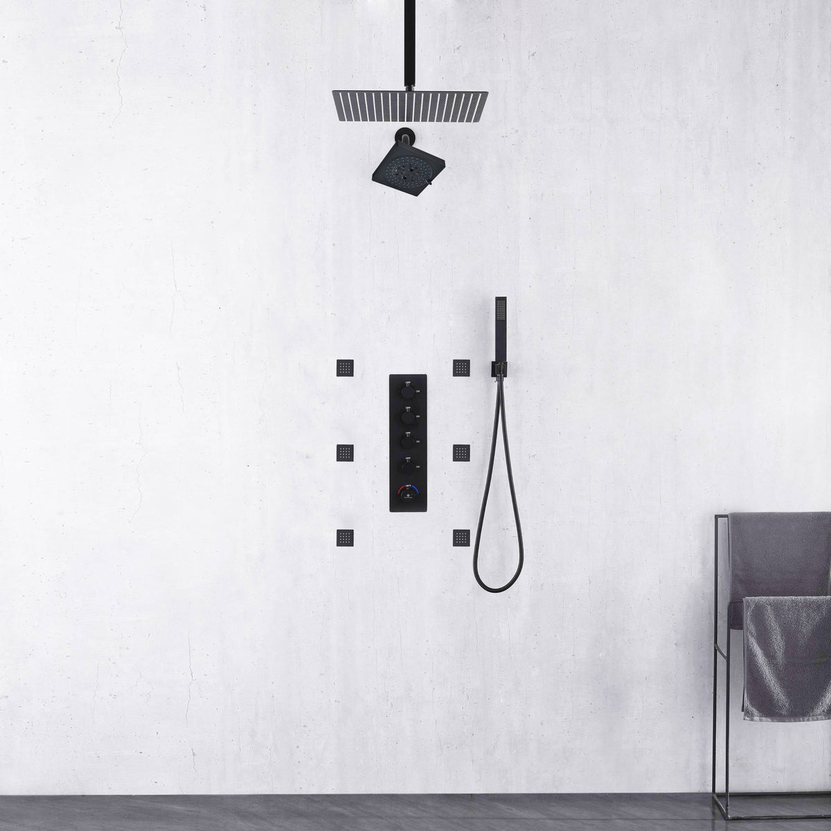Matte Black ceiling mount 12 inch or 16 inch rainfall shower head wall mount 6 inch high water pressure regular shower head 4 way thermostatic shower faucet with 2 inch body jets