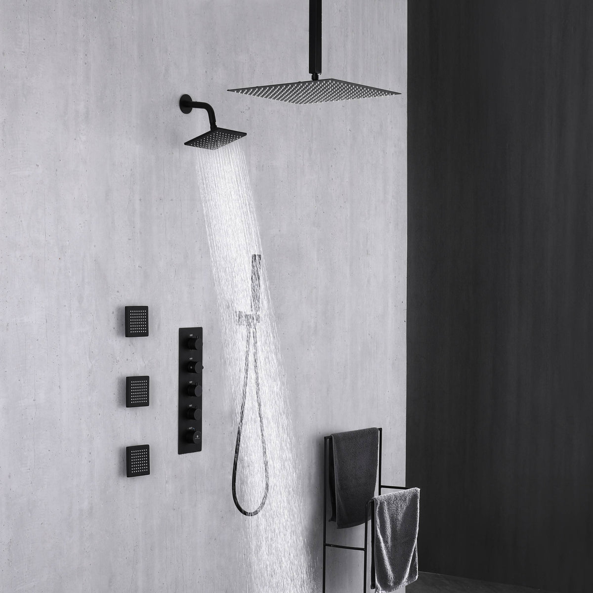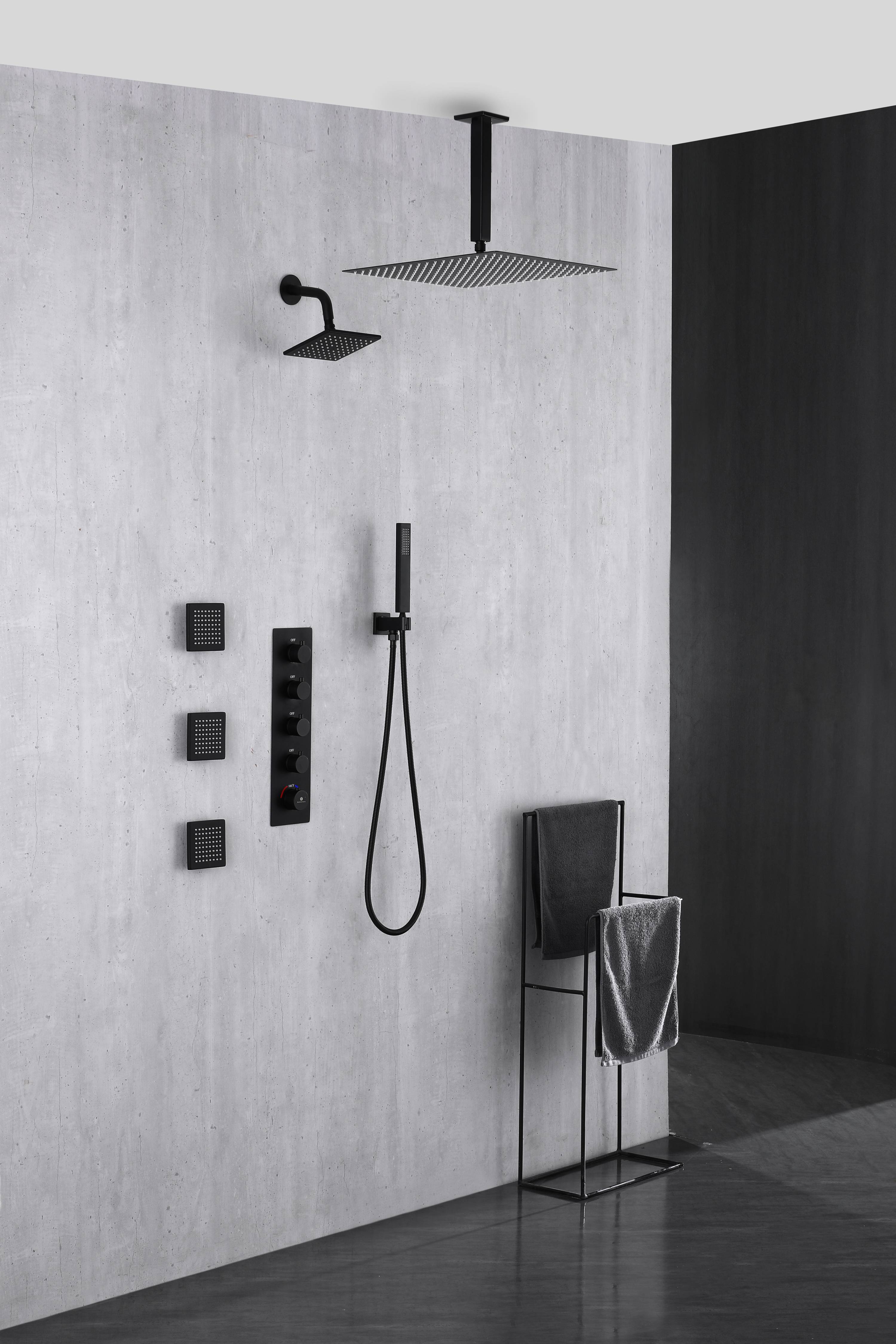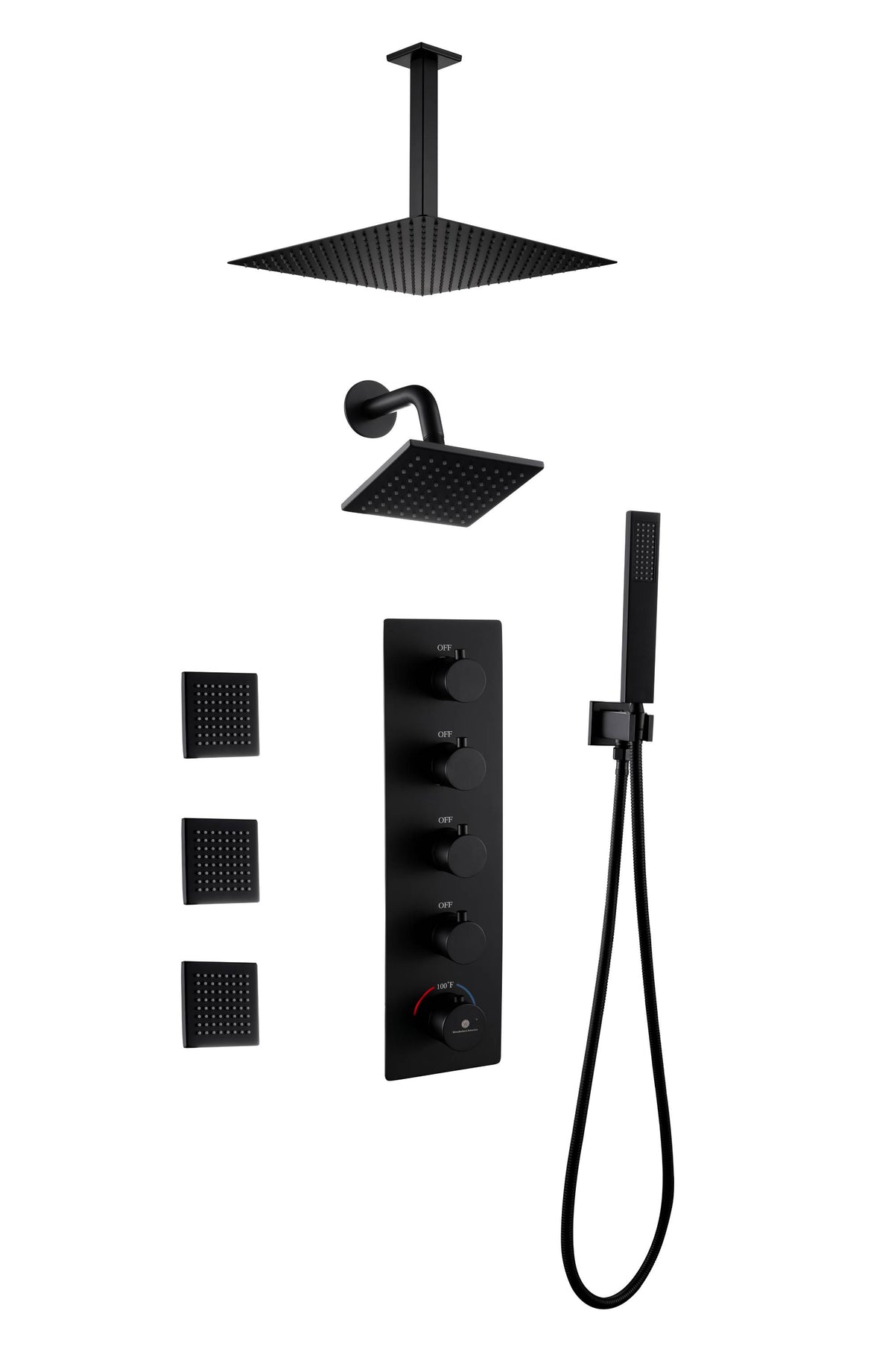 Matte Black ceiling mount 12 inch or 16 inch rainfall shower head wall mount 6 inch high water pressure regular shower head 4 way thermostatic shower faucet with 4 inch body jets