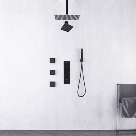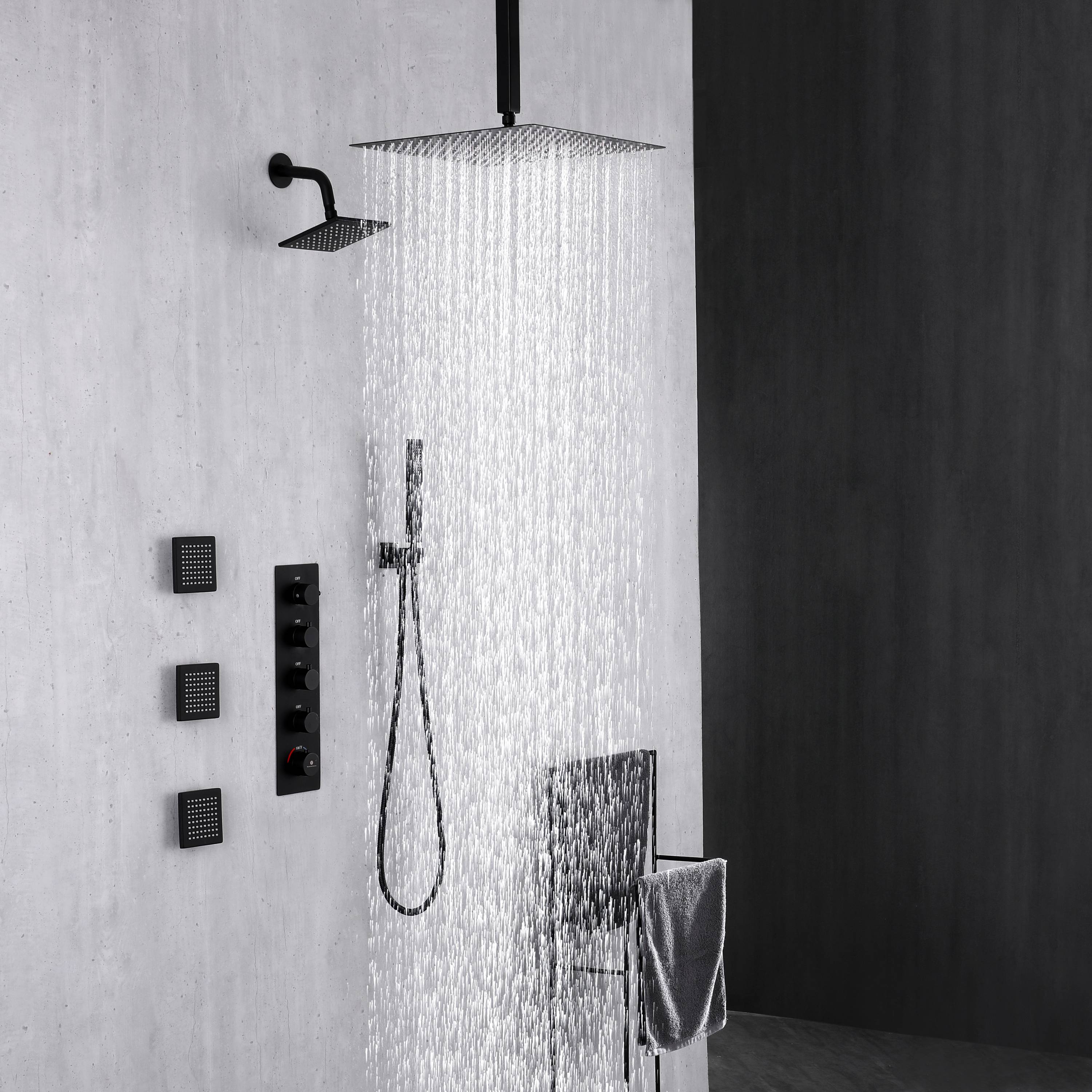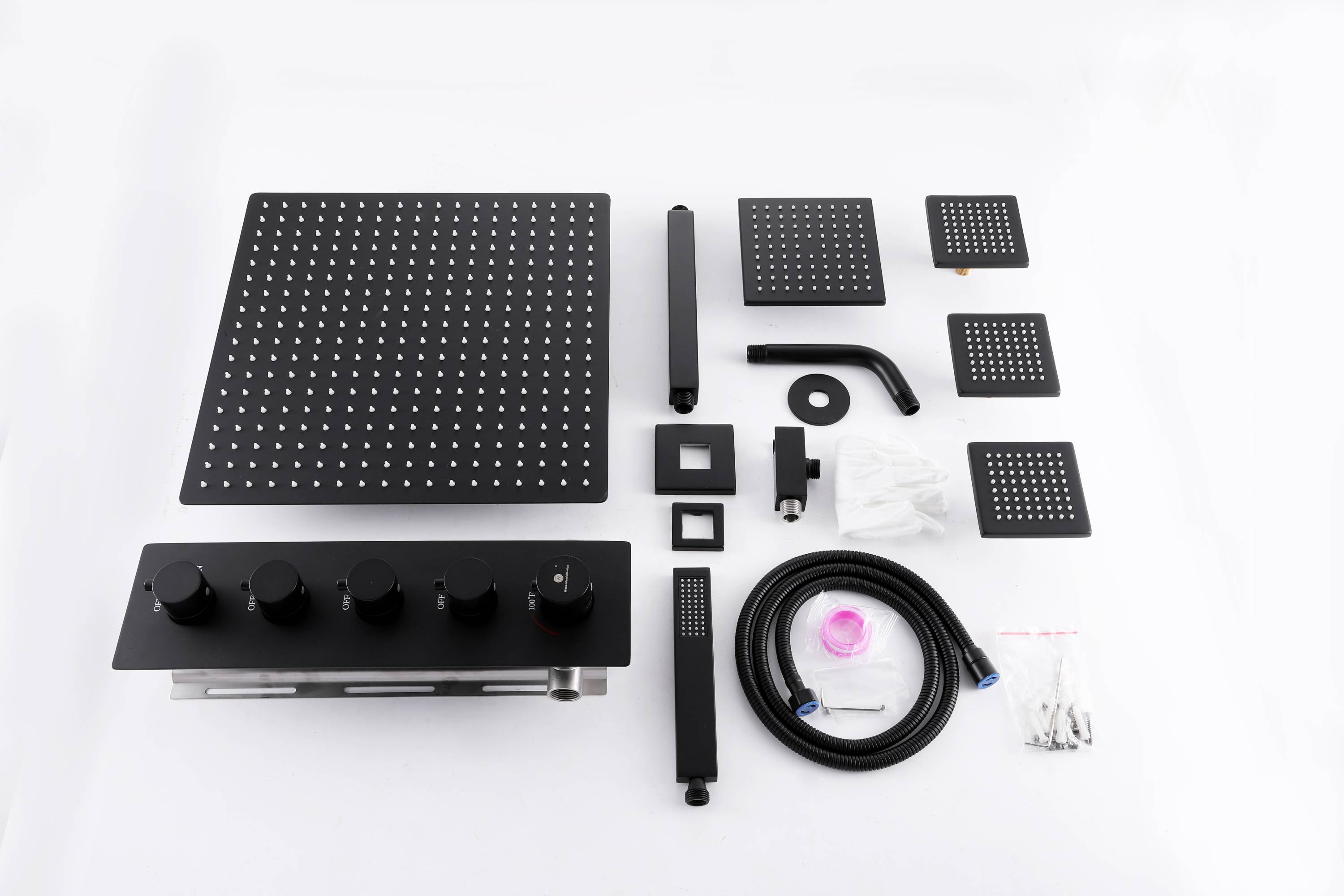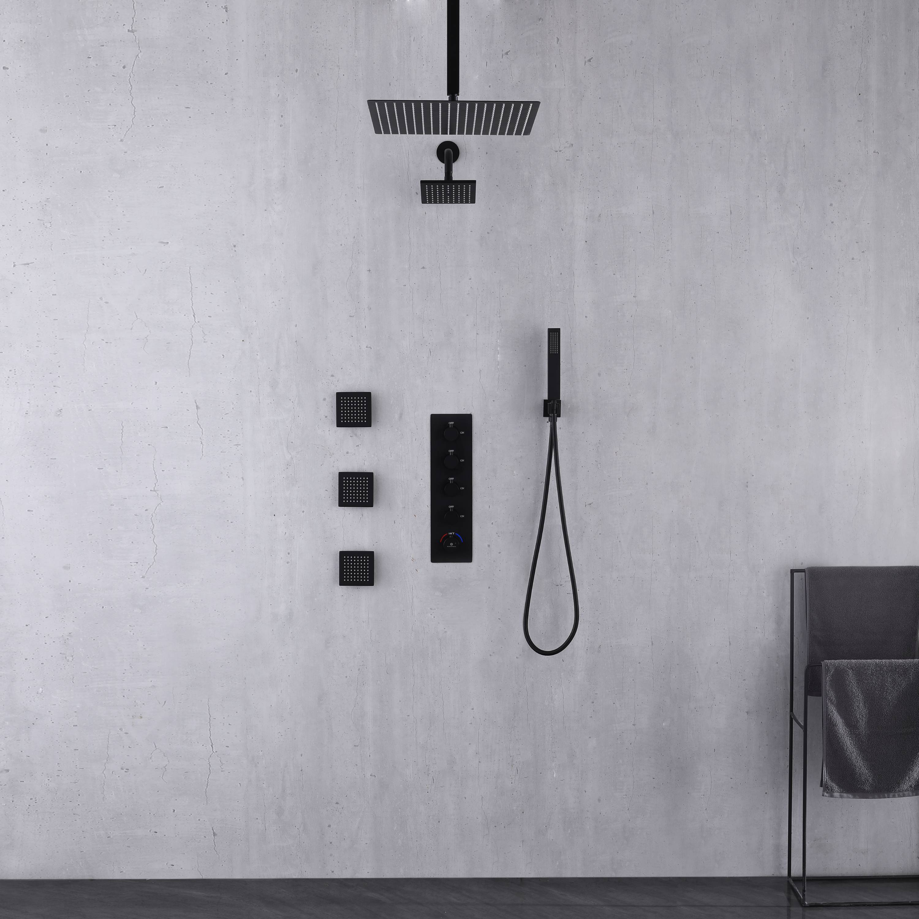 Matte Black ceiling mount 12 inch or 16 inch rainfall shower head wall mount 6 inch high water pressure regular shower head 4 way thermostatic shower faucet with 4 inch body jets