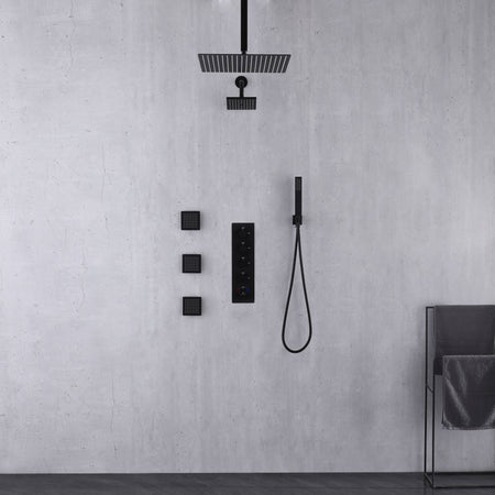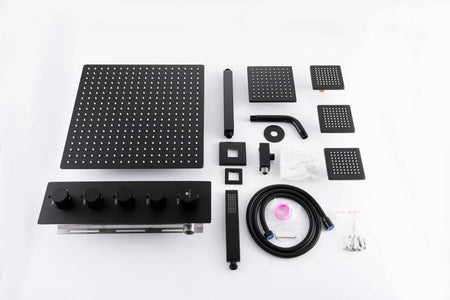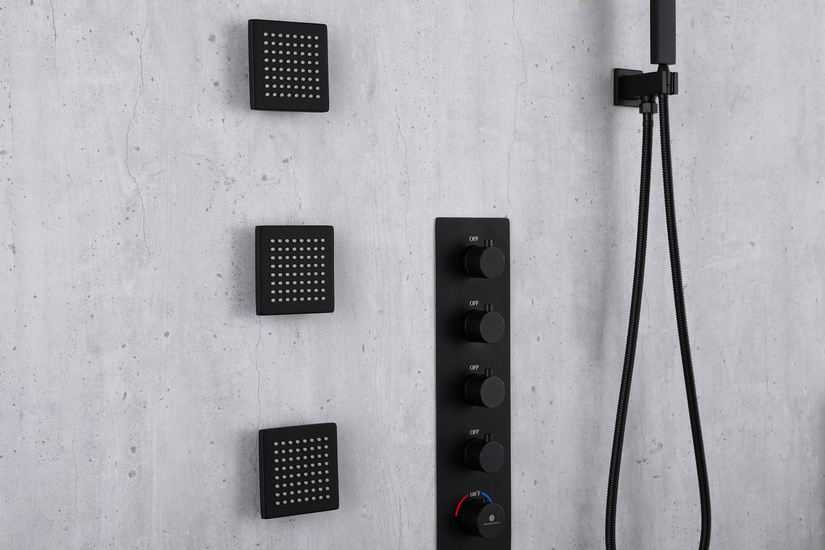 Introducing our exceptional matte black shower system, designed to transform your daily bathing routine into a luxurious and indulgent experience. Crafted with meticulous attention to detail, this shower system boasts a 4-way thermostatic valve with trim, allowing you to effortlessly control and customize each function according to your preferences. With adjustable knobs for water flow, pressure, and temperature, you have complete control over your showering experience.