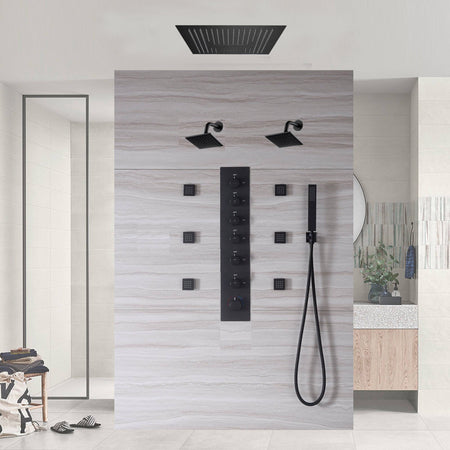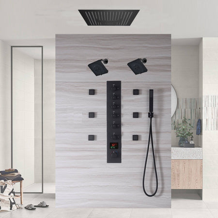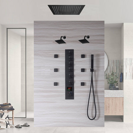 Matte Black LED Music Shower System: 16" with 6-Way Digital Thermostatic Control, Body Jets
