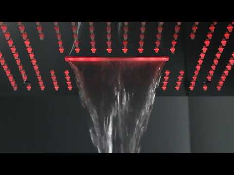 The 16'' x 16" stainless steel head features rainfall and waterfall settings, controllable via touch panel, remote, or smartphone. -
