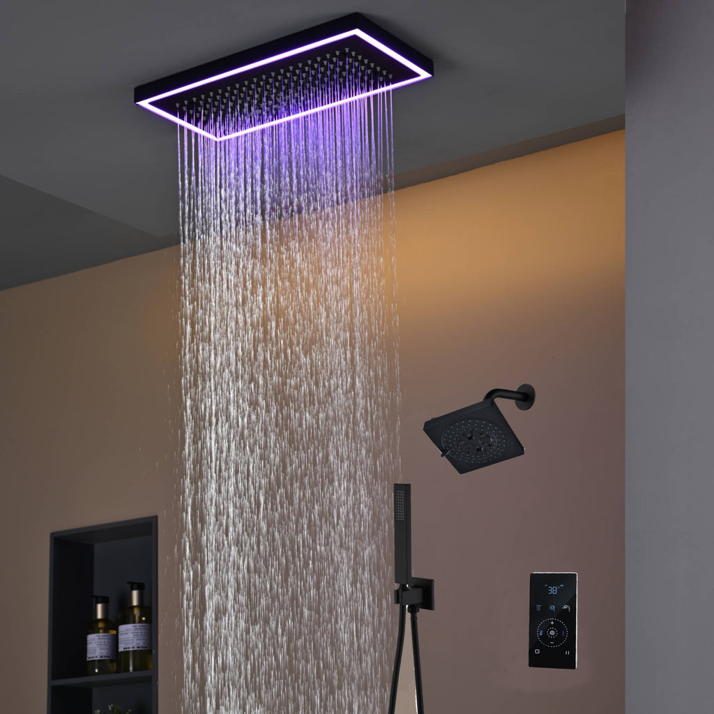 Matte Black or Brushed Gold or Brushed Nickel 16 x 8 inch rainfall Flush mount Shower Head 3-Way digital display touch panel Shower Faucet with 6'' regular head