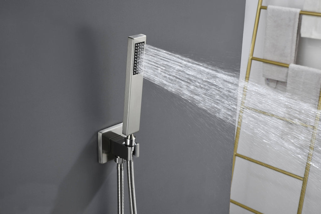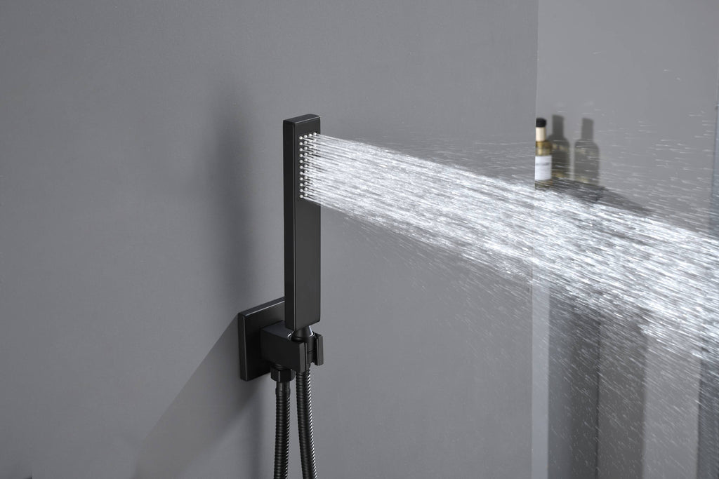 The shower system also features an 16 x 8 inch flush-mounted Rain shower head made of brass, with an built-in 64 led light that work by 6~12 V electronic power and we may use remote panel to control 64 led light. A 59-inch stainless steel shower hose and a brass shower holder with an NPT 1/2 inch male thread are also included, making this system comprehensive and easy to install.